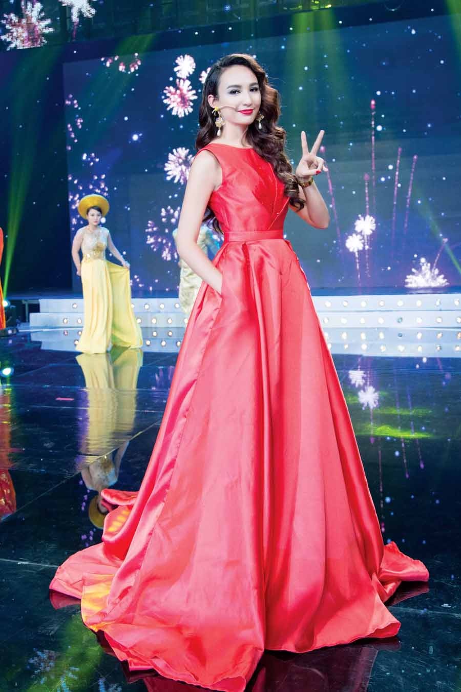 | Đảm nhận vai trò MC một chương trình diễn ra trong tuần, Ngọc Diễm khoe dáng với thiết kế đầm xòe tông đỏ bắt ánh nhìn. Mái tóc xoăn gợn sóng cùng trang điểm đồng màu giúp cô nổi bật trên sân khấu. Ảnh: Tiên Nguyễn |