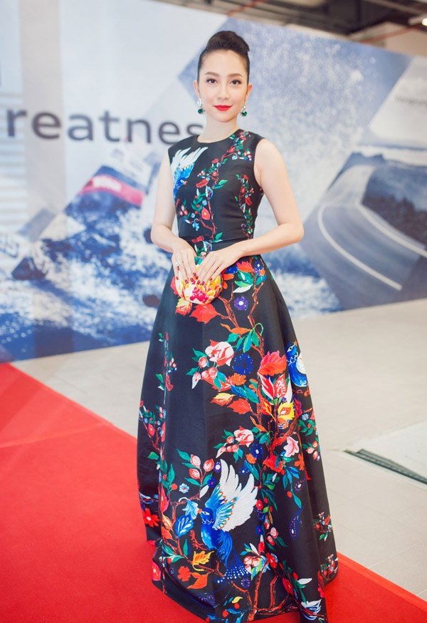 | Linh Nga duyên dáng trong bộ đầm phom cổ điển. Trang phục tối giản, màu đen trầm trở nên thu hút nhờ họa tiết thiên nhiên bắt ánh nhìn. Ảnh: An Trần |