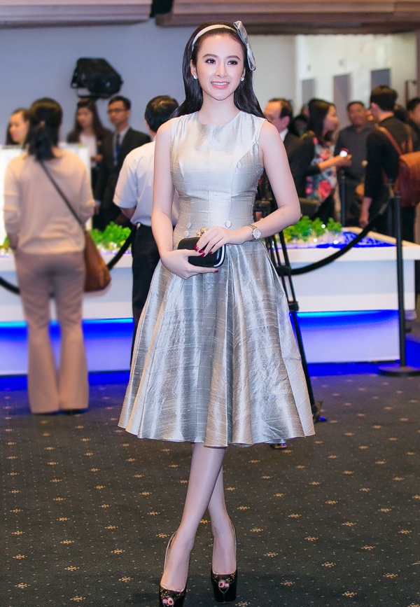 | Phương Trinh bất ngờ đổi phong cách từ gợi cảm, táo bạo sang nhẹ nhàng. Bộ váy nữ tính, chất liệu ánh nhũ bạc vừa vặn vóc dáng, giúp người mặc trở nên thanh lịch. Ảnh: Huy Bình |