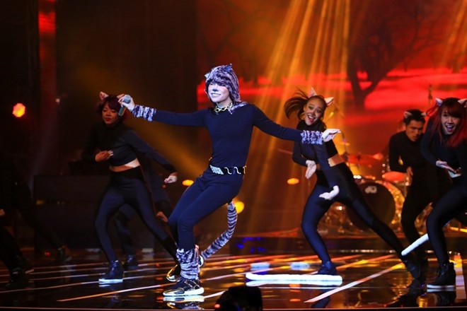 | Trong đêm thi trước, Hoàng Tôn đã bị “cảnh cáo” bởi giám khảo Phương Uyên vì liên tục quên lời trong hit Đường cong của Thu Minh. Chính vì vậy, Hoàng Tôn đã “hóa mèo” khi trình diễn The Rum Tum Tugger - ca khúc trong vở nhạc kịch nổi tiếng thế giới “Cats”. (Ảnh chụp bởi Mobiistar Prime X) |
