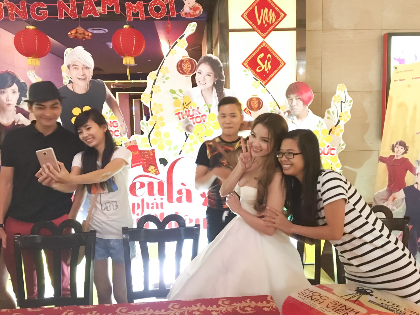 | Thủy Top và Khương Ngọc thân thiện chụp selfie cùng khán giả trước giờ chiếu phim. |