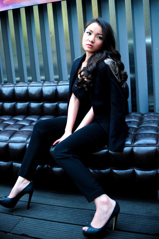 Hot girl đình đám một thời diện bộ jumpsuit màu đen khoe trọn đôi vai thon và vòng một đầy đặn. Vừa từ Mỹ trở về, cô có buổi giới thiệu album "Meo" tại TP.HCM vào chiều 9/1.