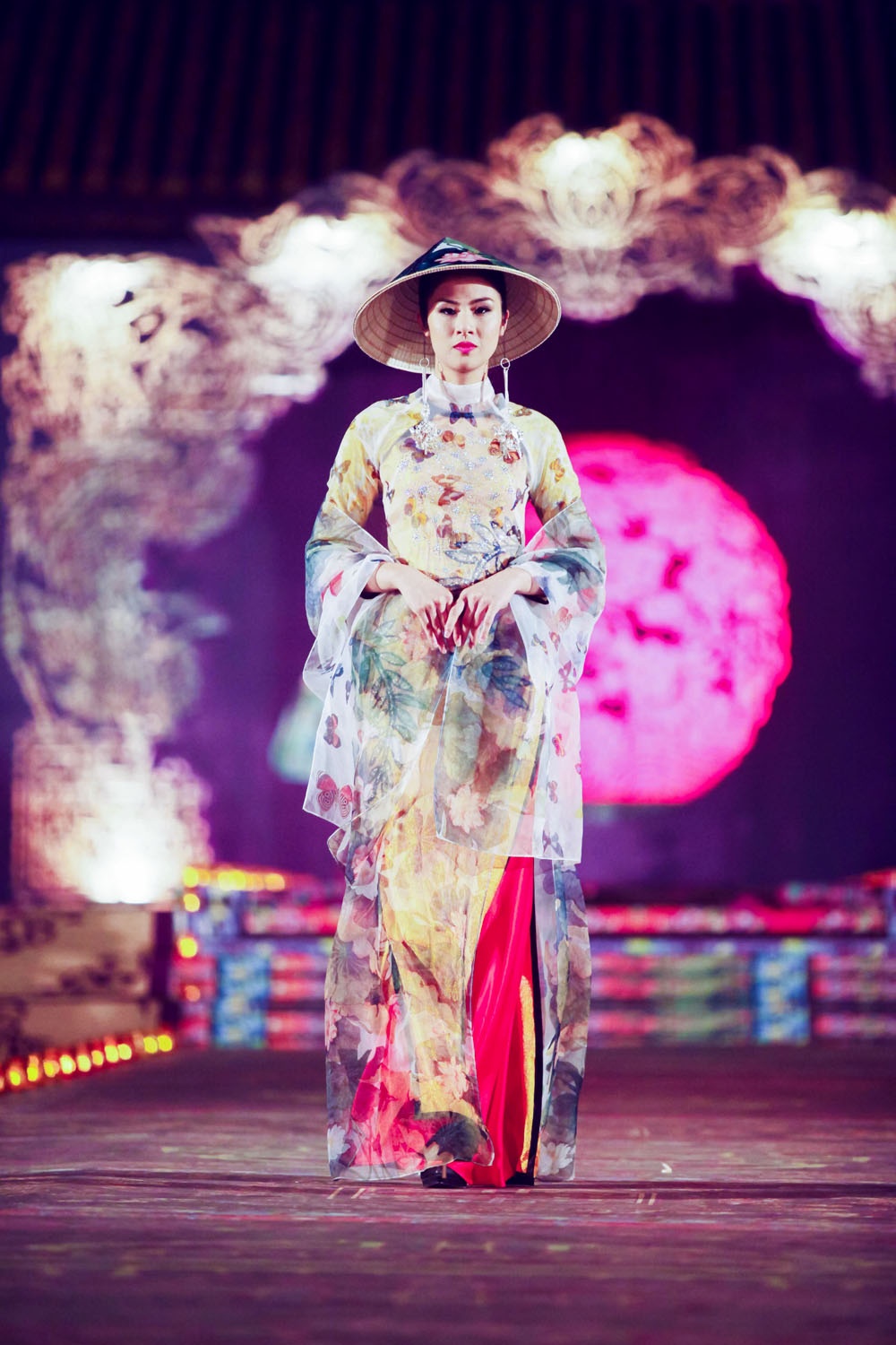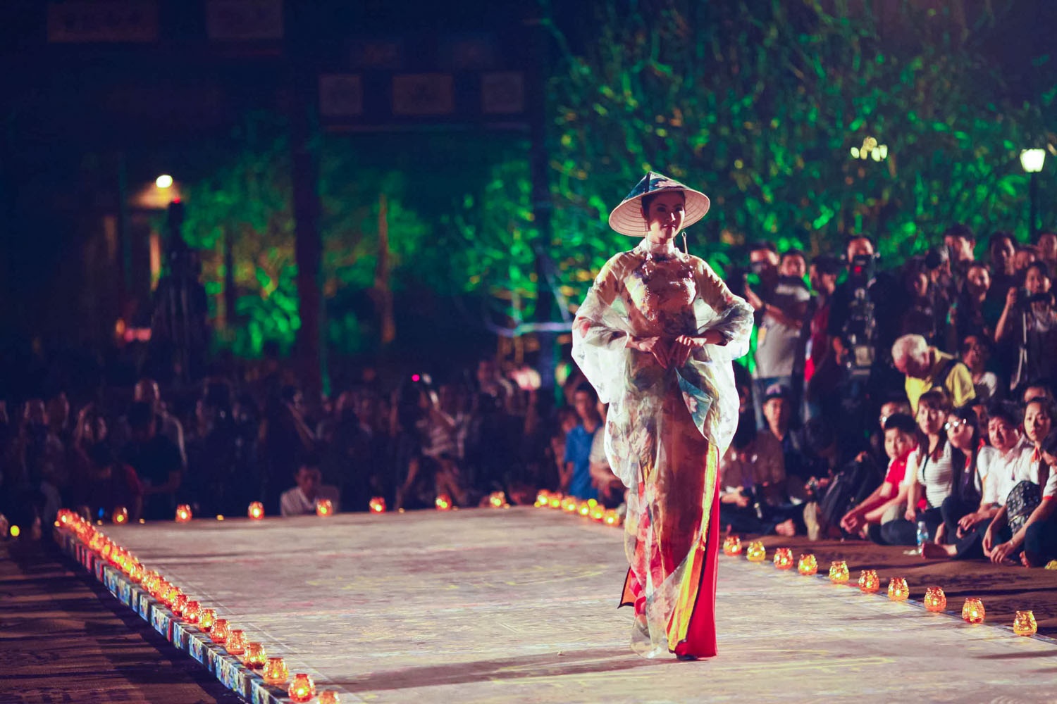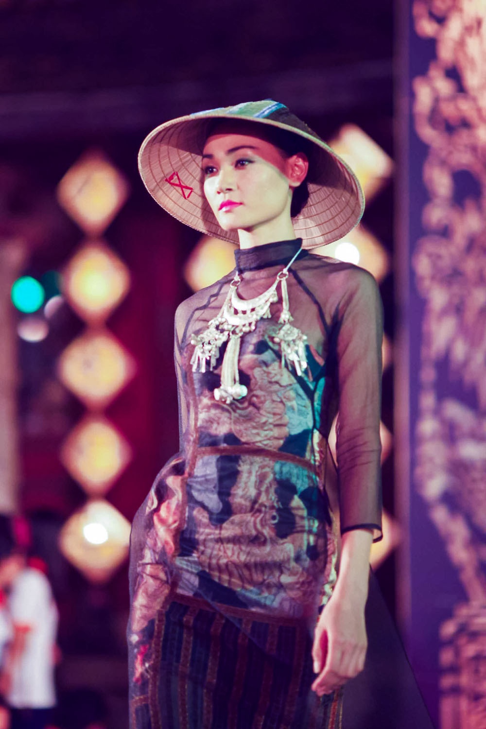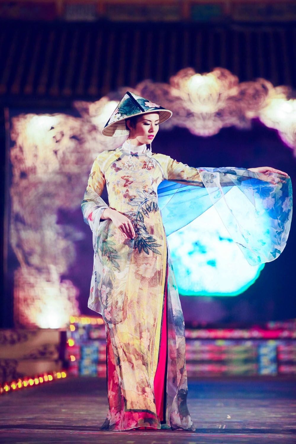 Tối 13/4, NTK Võ Công Khanh giới thiệu BST thời trang áo dài có chủ đề dân gian đương đại tại đêm diễn mang tên Đêm phương Đông thuộc khuôn khổ Festival Huế 2014. Dàn người mẫu đình đám hai miền Bắc - Nam góp mặt trình diễn BST áo dài lần này của Công Khanh.