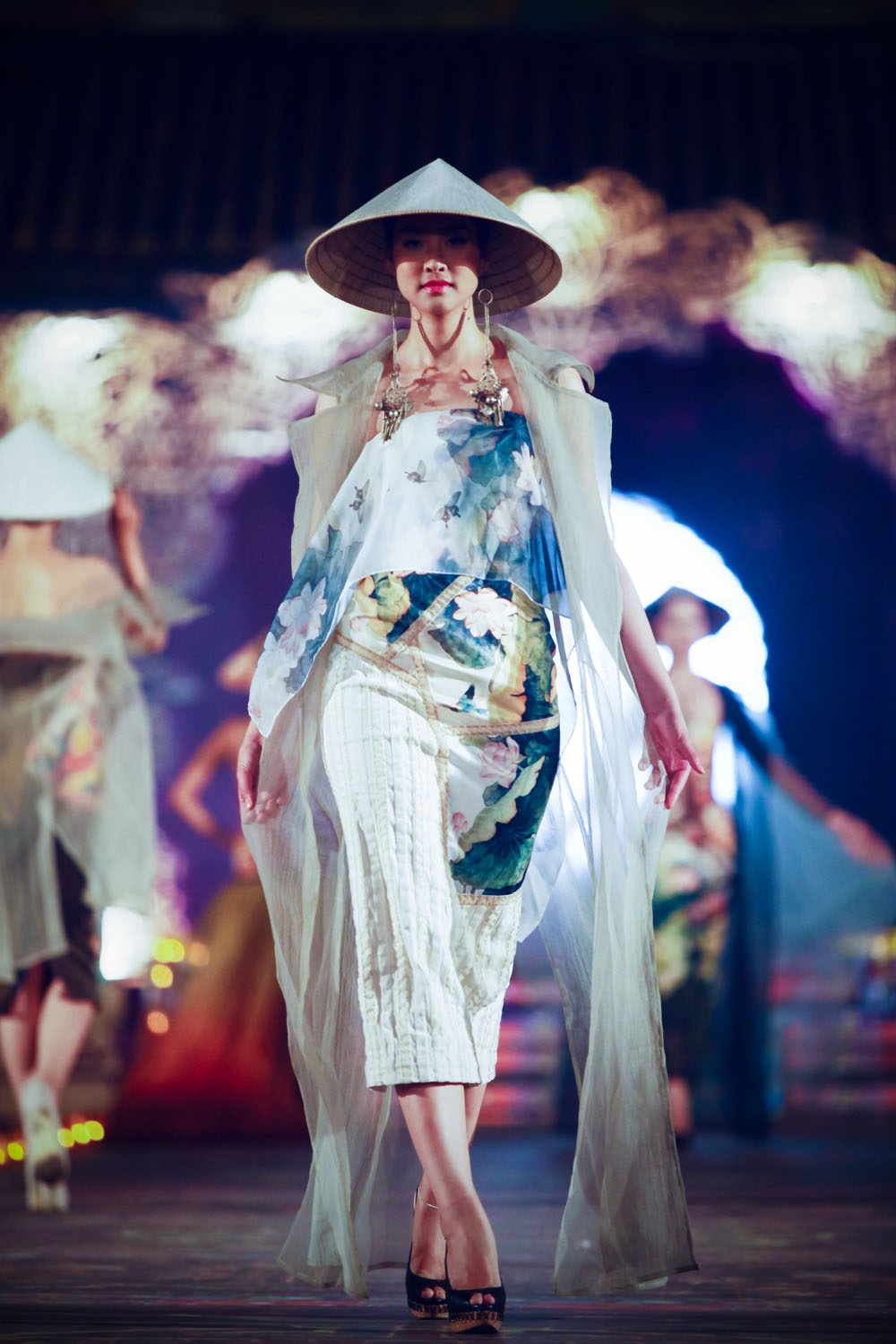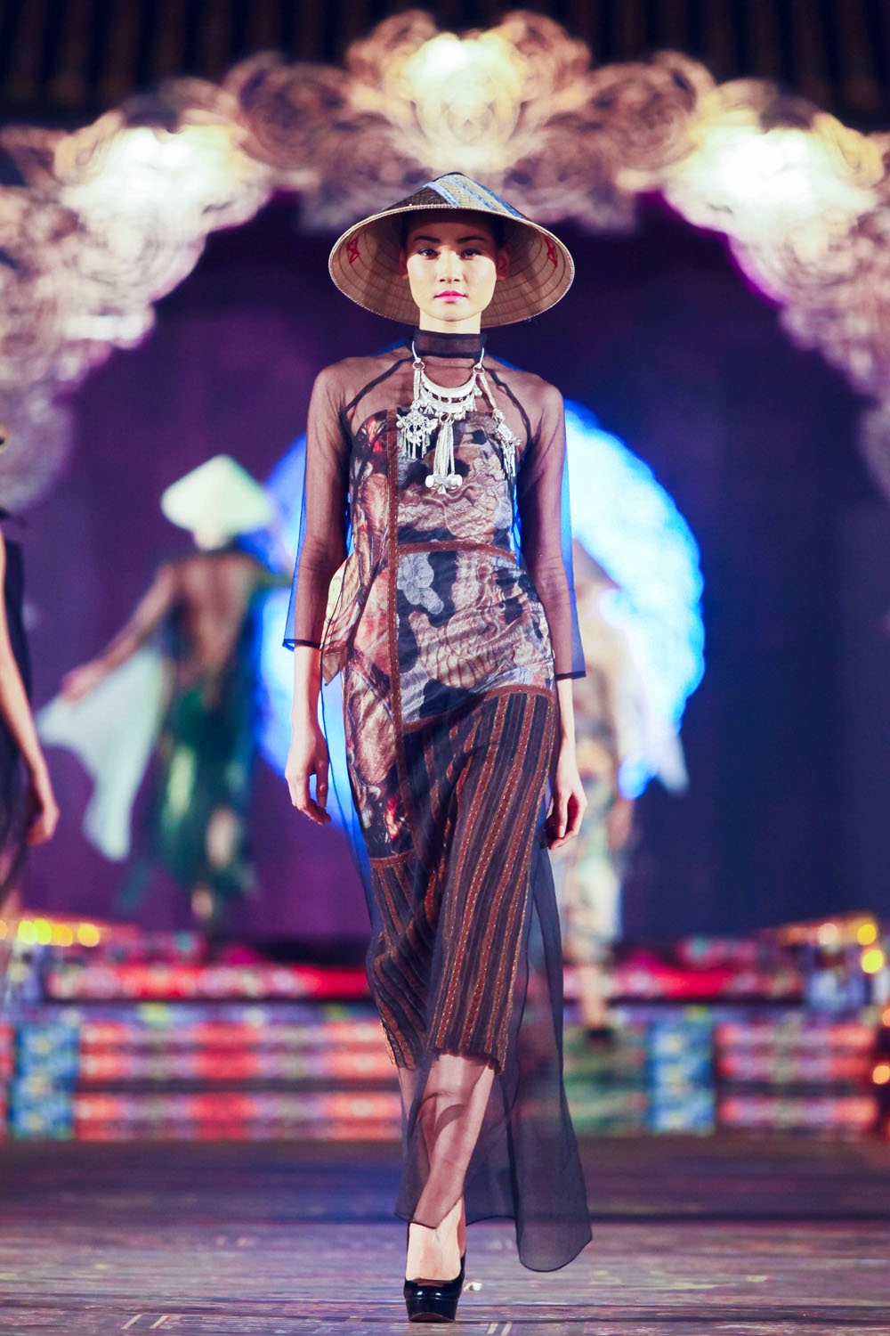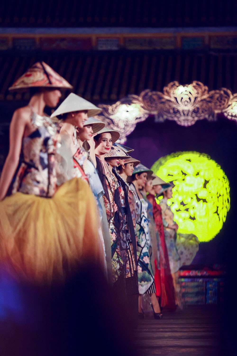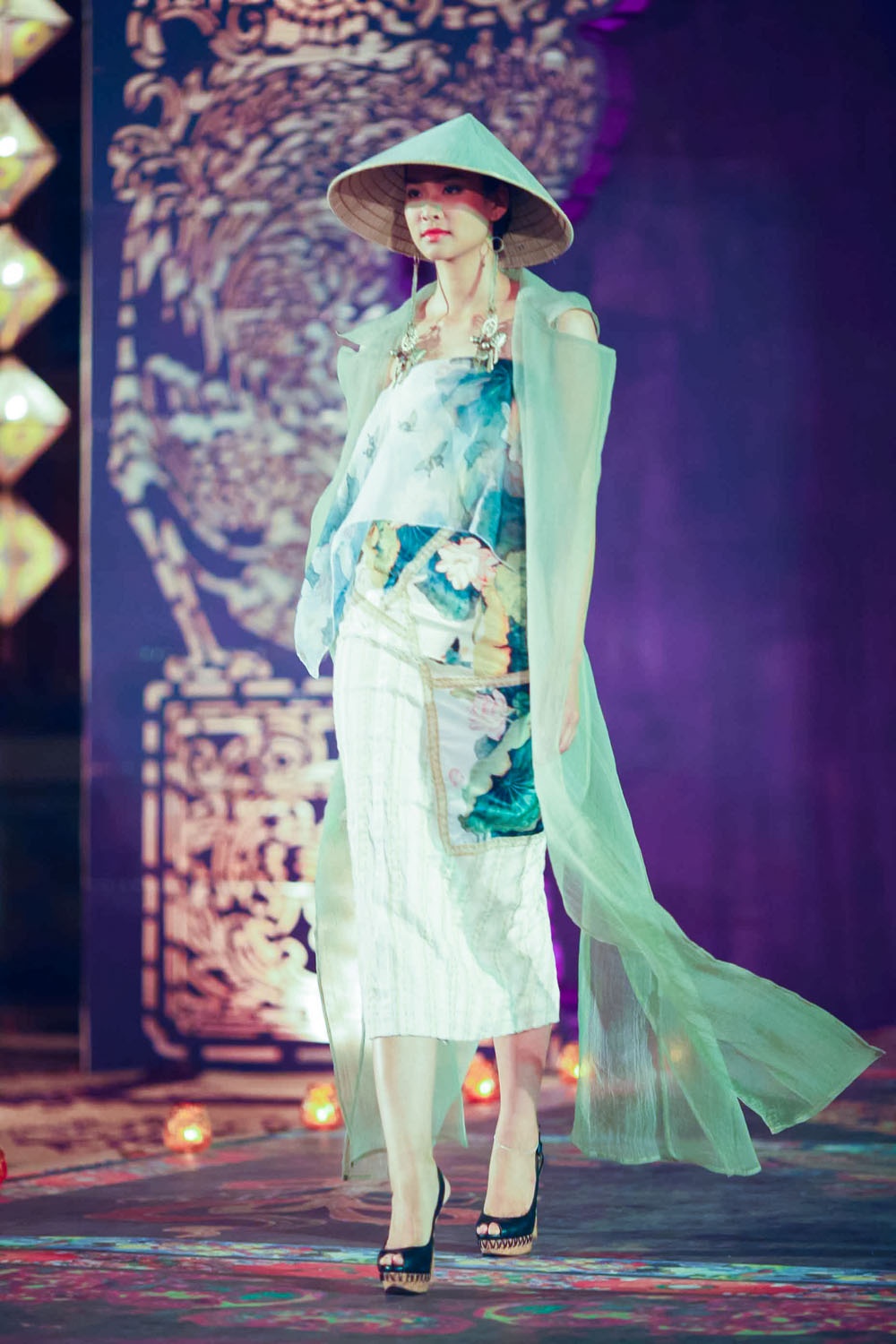 Tối 13/4, NTK Võ Công Khanh giới thiệu BST thời trang áo dài có chủ đề dân gian đương đại tại đêm diễn mang tên Đêm phương Đông thuộc khuôn khổ Festival Huế 2014. Dàn người mẫu đình đám hai miền Bắc - Nam góp mặt trình diễn BST áo dài lần này của Công Khanh.