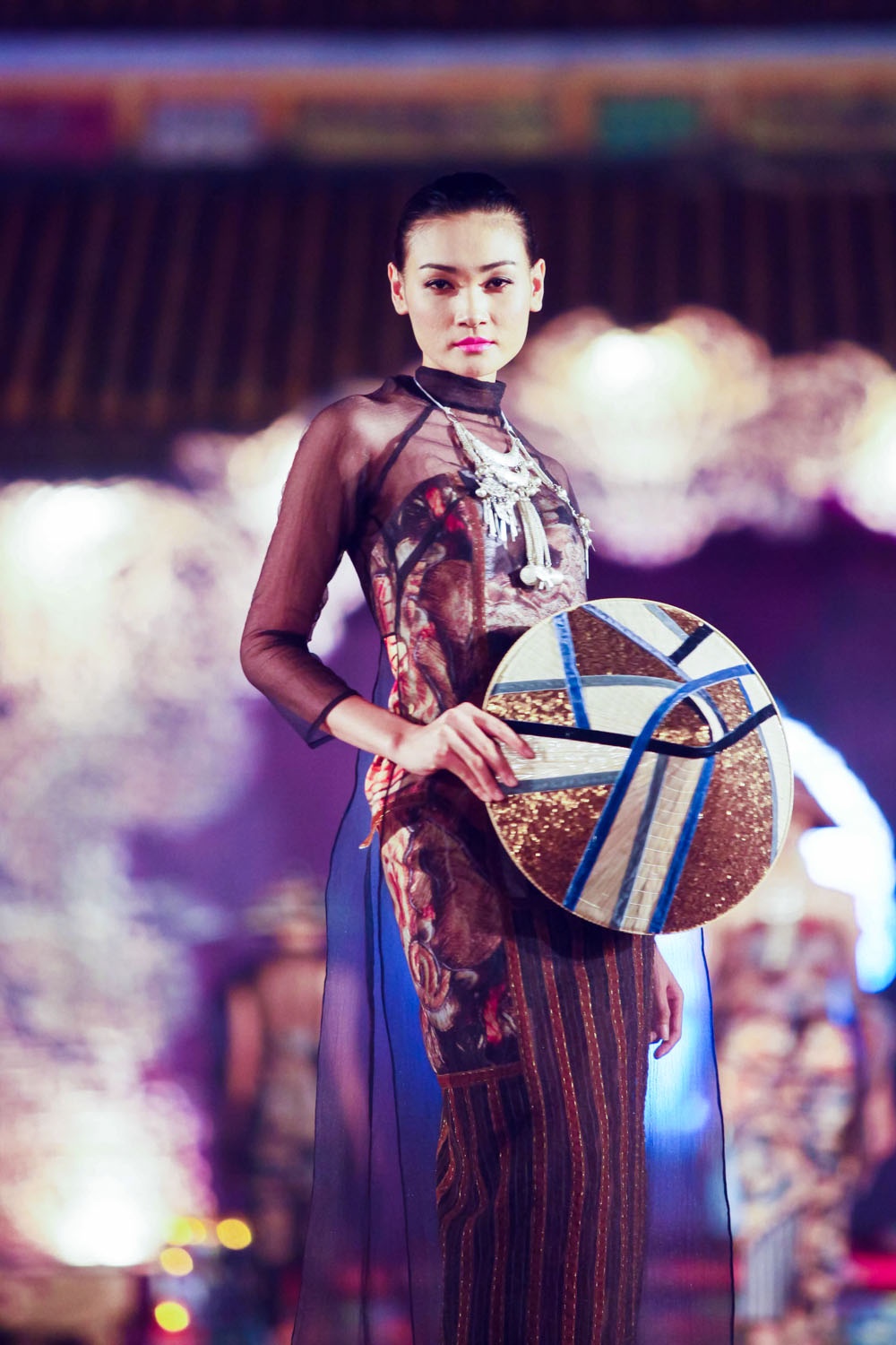 Nữ người mẫu thể hiện mẫu thiết kế áo dài có chất liệu hiện đại, gợi cảm mix cùng họa tiết dân tộc tinh tế.