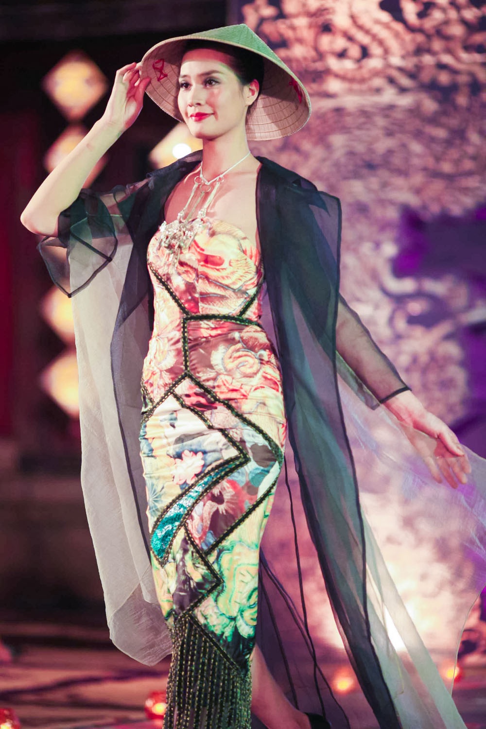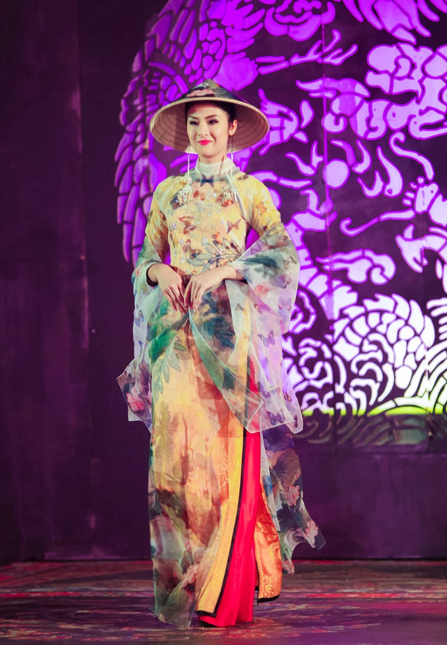 | Hoa hậu Ngọc Hân đảm nhận vai trò mở màn BST này. Cô diện mẫu áo dài cách điệu, chất vải trong suốt, in họa tiết nổi bật. |