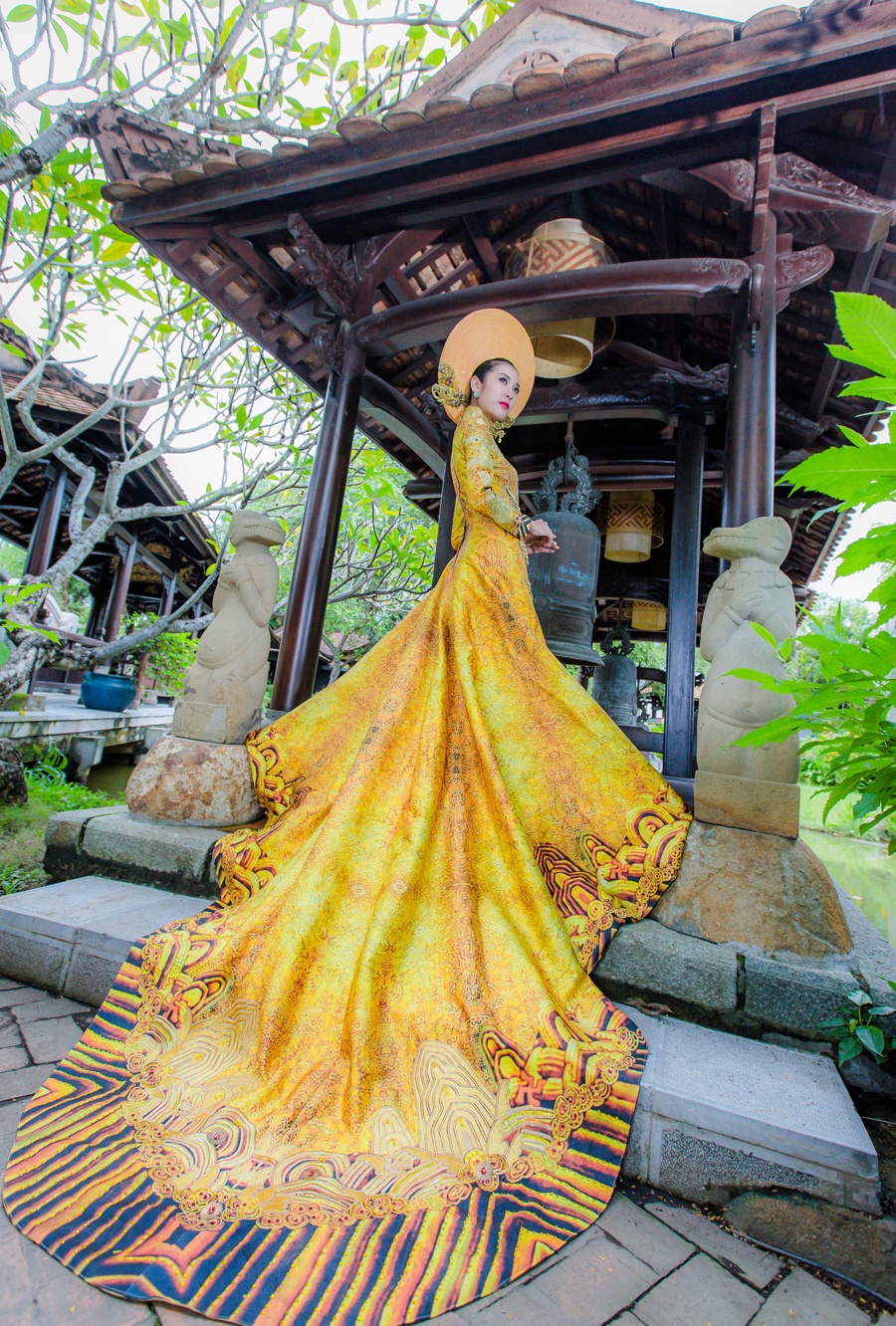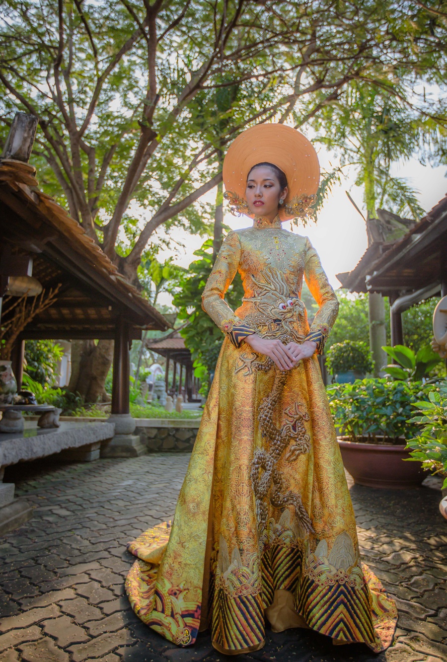 | Tổng thể trang phục là áo dài nhưng được sử dụng hoàn toàn kỹ thuật thêu tay, cắt váy hiện đại. Những đường thêu đẹp mắt đã phải sử dụng gần 1000 tép chỉ Koma Japan. Đặc biệt, hình ảnh con rồng dài gần một 1,2 m được thêu tỉ mỉ tạo hiệu ứng 3D trên bề mặt trang phục. |