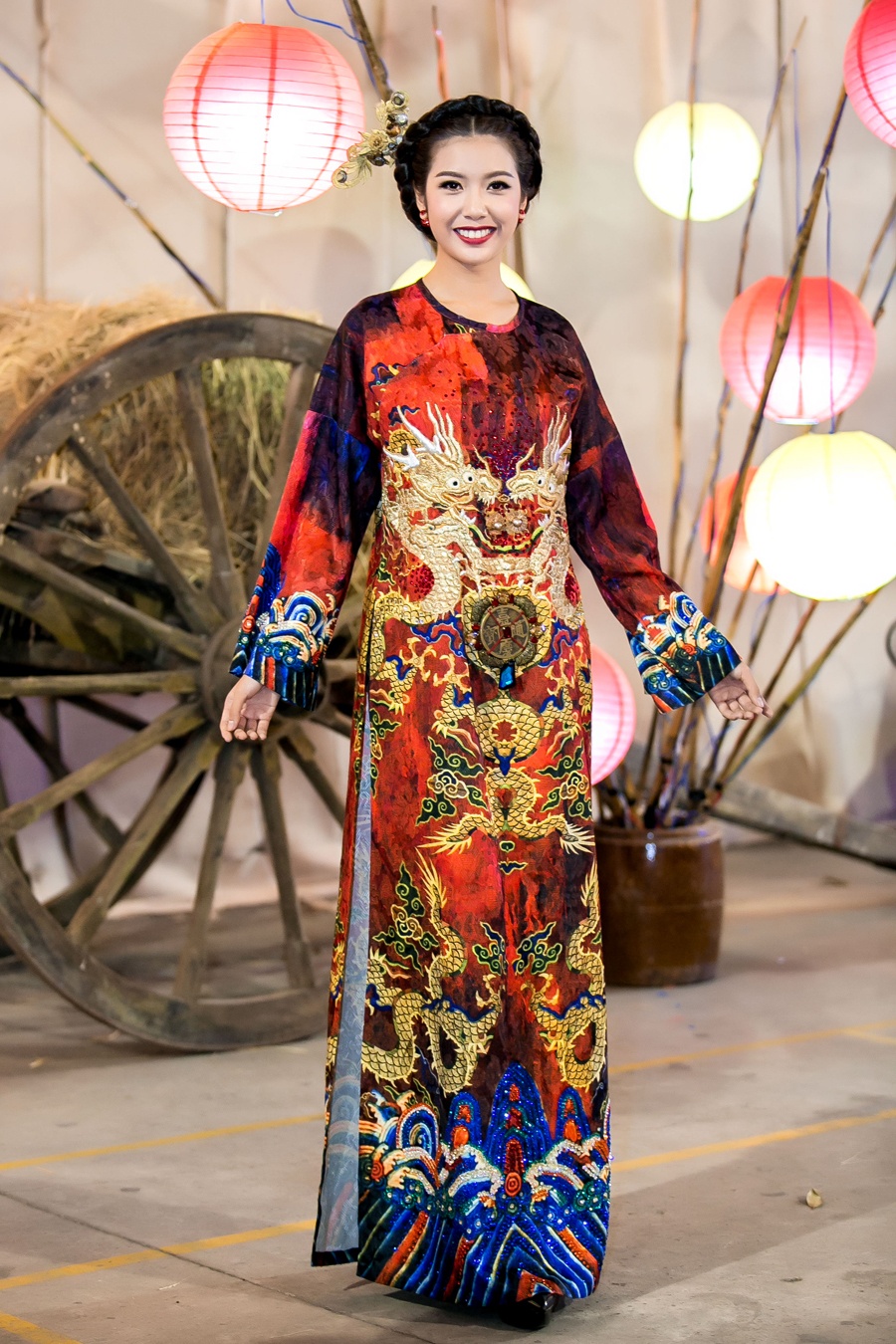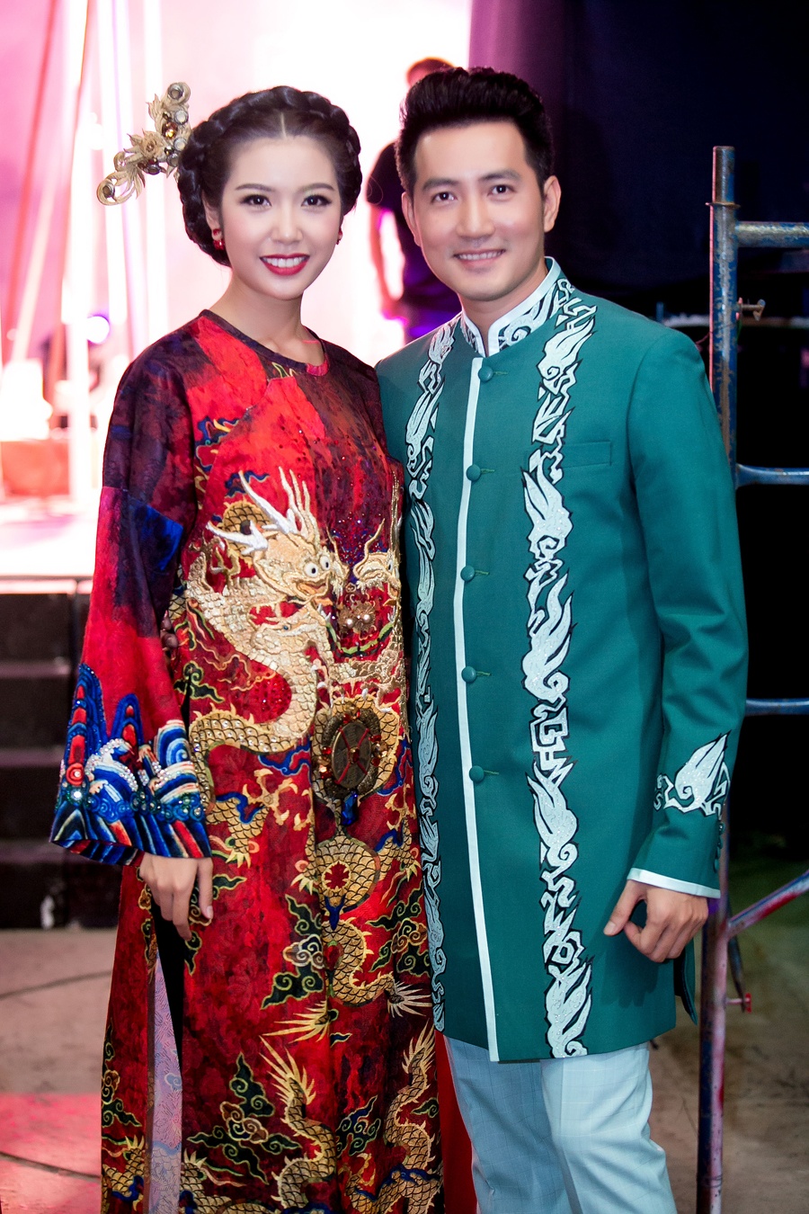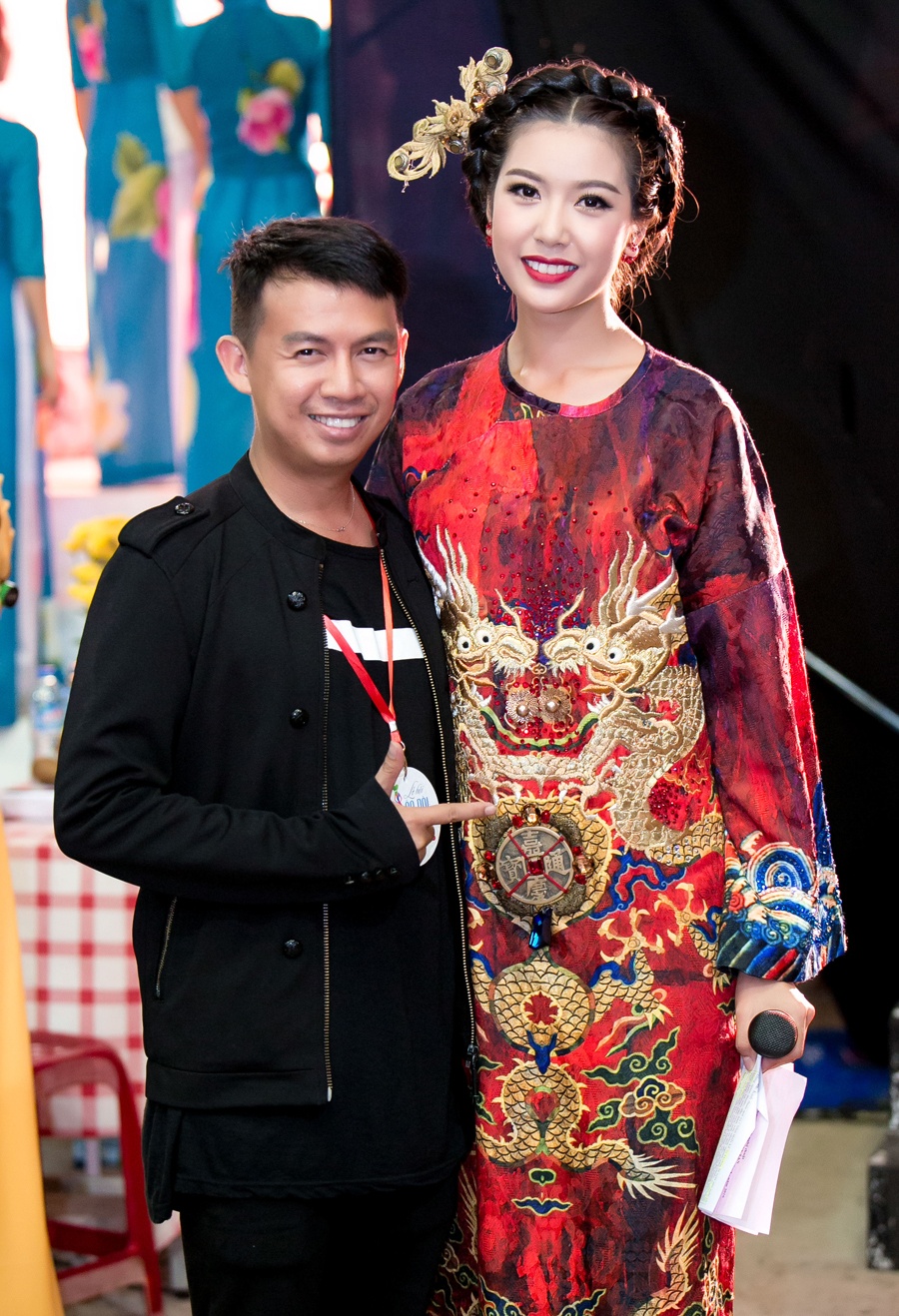 | Người đẹp rạng rỡ với áo dài gấm giao thoa giữa hiện đại và truyền thống. Thiết kế sử dụng khoảng 500 tép chỉ mạ vàng của Nhật Bản và 1.000 viên pha lê đính kết trên thân áo. Trong ảnh, người đẹp sinh năm 1993 chụp hình kỷ niệm cùng Nguyễn Phi Hùng. |