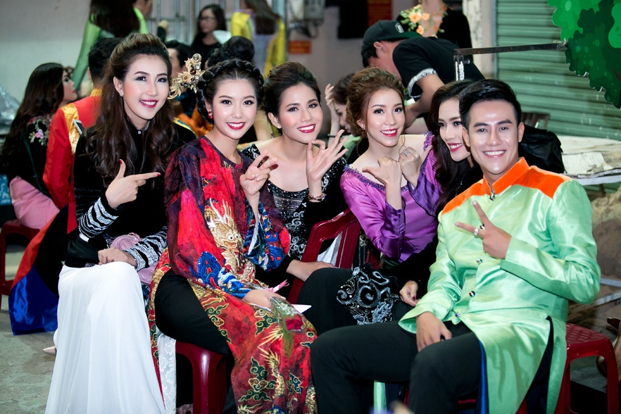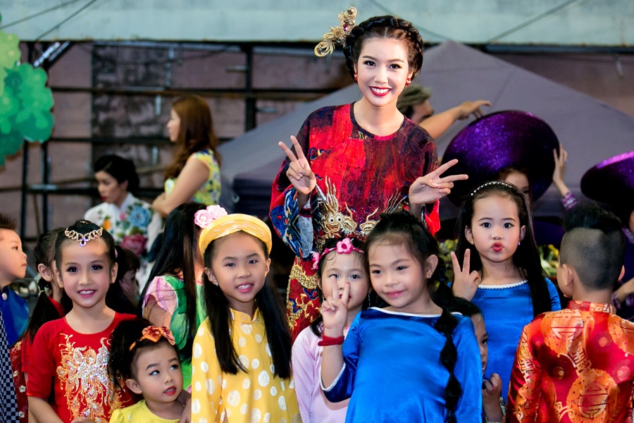 | Người đẹp tranh thủ chụp ảnh kỷ niệm với các mẫu nhí. Các bé cũng được diện áo dài rất đáng yêu. |