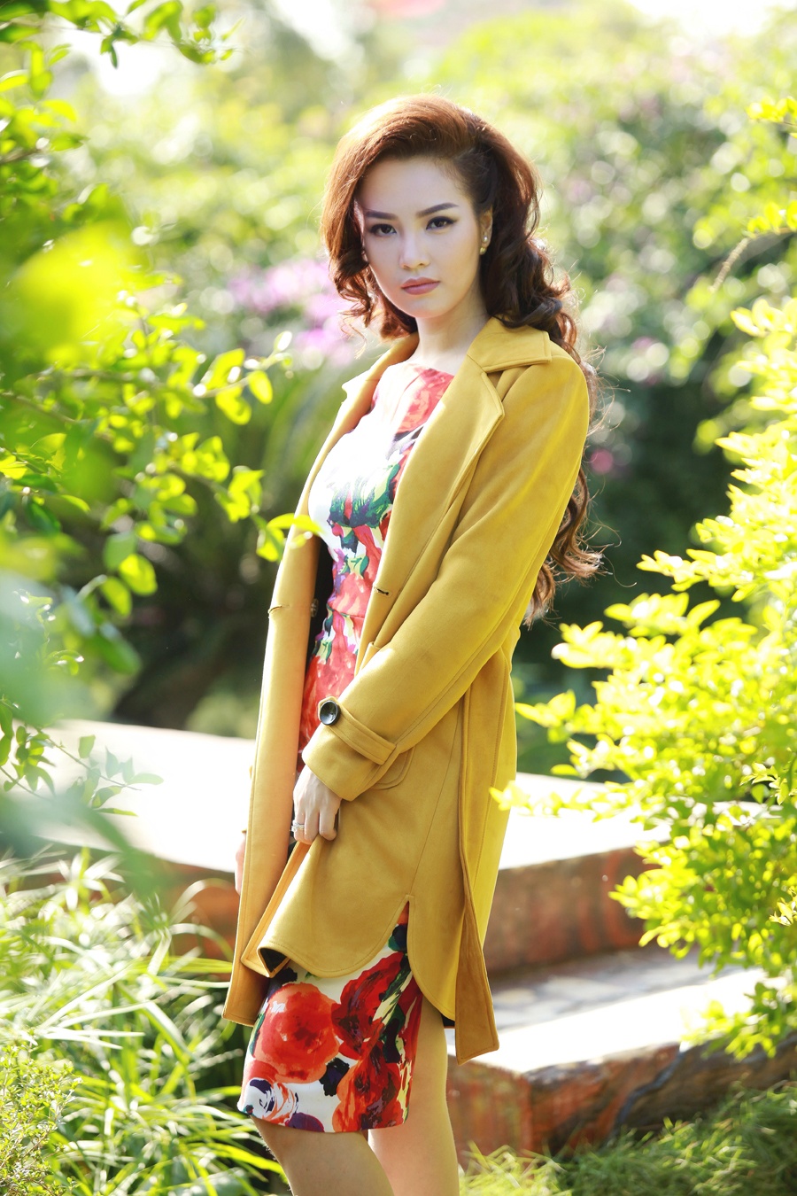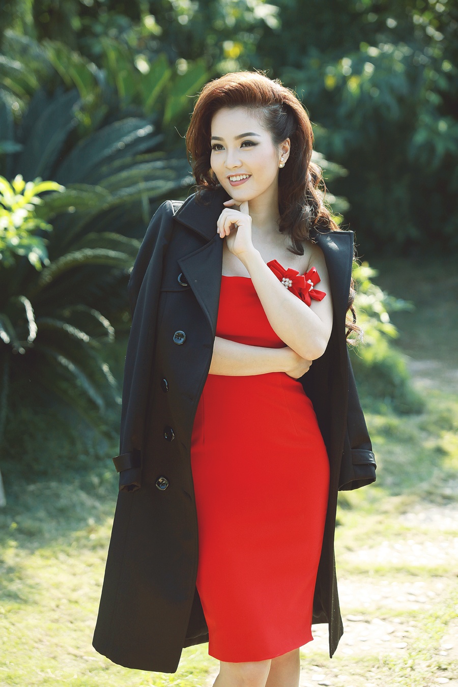 | Á hậu trông quyến rũ và cuốn hút hơn trong bộ đầm quây, tông màu đỏ bắt mắt. Áo khoác măng-tô bên ngoài giữ ấm trong tiết trời se lạnh. |