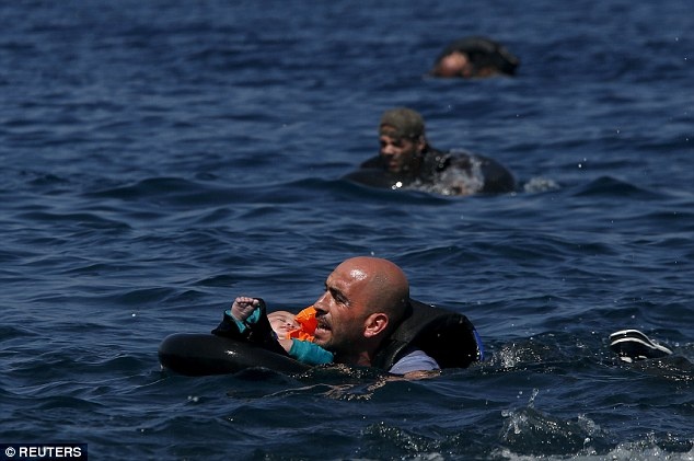 Một người đàn ông Syria ôm con hai tháng tuổi giữa dòng nước sau khi xuồng chở người tị nạn xì hơi ở khu vực cách đảo Lesbos của Hy Lạp khoảng 100 m hôm 13/9. Vụ việc xảy ra cùng ngày khi thuyền chở khoảng 100 người tị nạn lật ở khu vực phía nam biển Aegean, ngoài khơi đảo Farmakonisi của Hy Lạp khiến 34 người chết đuối, gồm 15 trẻ nhỏ. Đây là vụ tai nạn với số lượng người di cư lớn nhất ở vùng biển Hy Lạp từ khi cuộc khủng hoảng dân nhập cư diễn ra. |