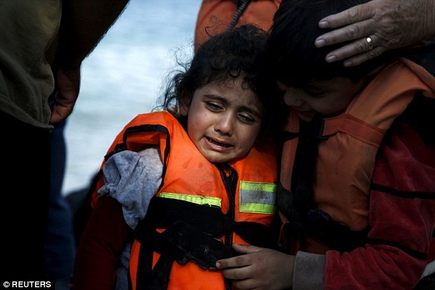 | Bé gái Syria bật khóc trong vòng tay của anh trai vì sợ hãi trước chuyến vượt biển kinh hoàng. |