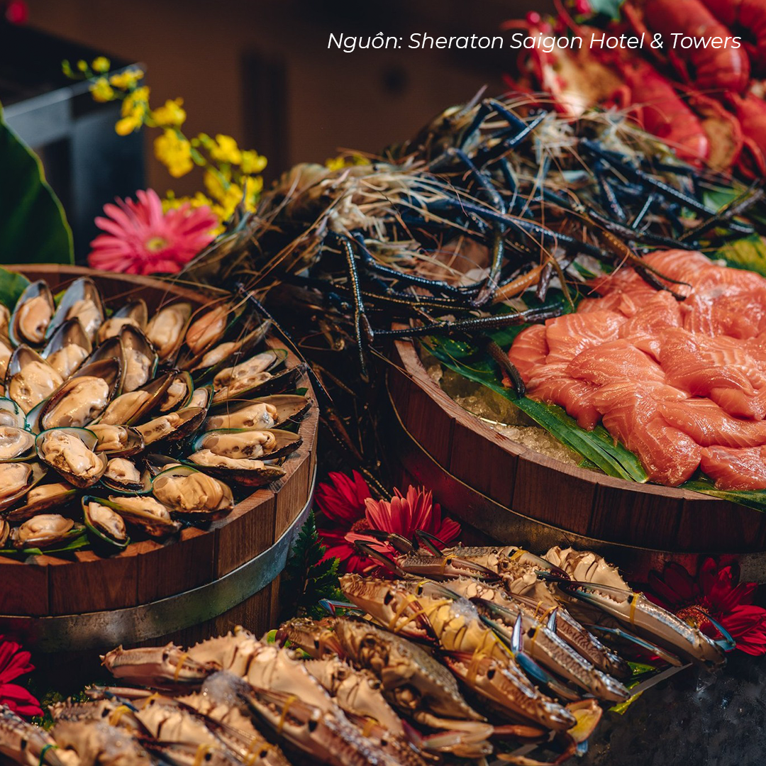 Với thực đơn đa dạng, buffet luôn là lựa chọn của nhiều người cho những bữa tiệc cuối năm. Trong những không gian nhà hàng sang trọng dưới đây, bạn có thể thỏa sức thưởng thức các loại hải sản tươi sống như tôm hùm, cua, ghẹ... được chế biến theo nhiều kiểu hấp dẫn.