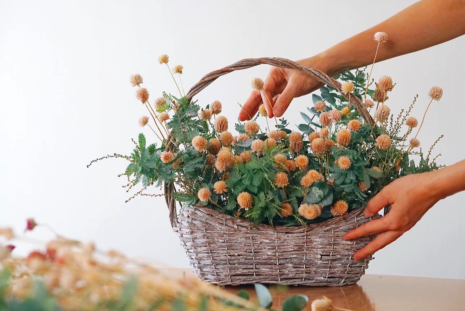Tận dụng giỏ hoa từng được tặng, chị thêm xốp rồi cắm cúc bách nhật nhà trồng đã để khô từ năm ngoái. Chị Lan cho biết: "Năm nào, tôi cũng làm một bó cúc bách nhật để khô lấy hạt sang năm trồng. Nhà tôi trồng cúc bách nhật màu hồng tím, hồng nhạt và trắng. Bữa tiệc này, tôi sử dụng cúc bách nhật tone hồng nhạt, khi để khô gam màu hoa có phần ngả sắc nude quyến rũ".
