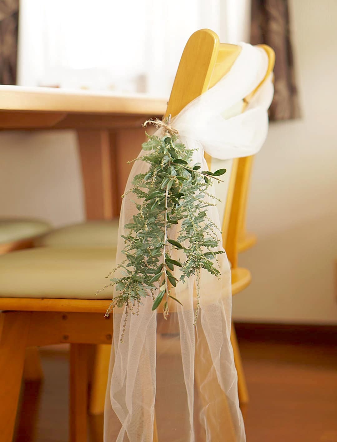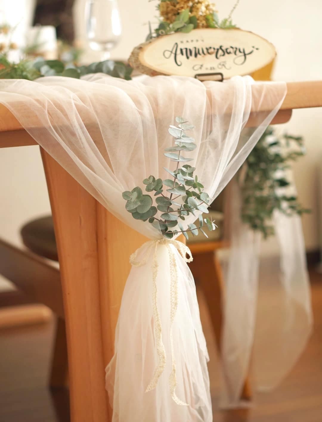 Bàn ghế thêm phần tinh tế nhờ lớp vải voan và chùm lá cách điệu. |