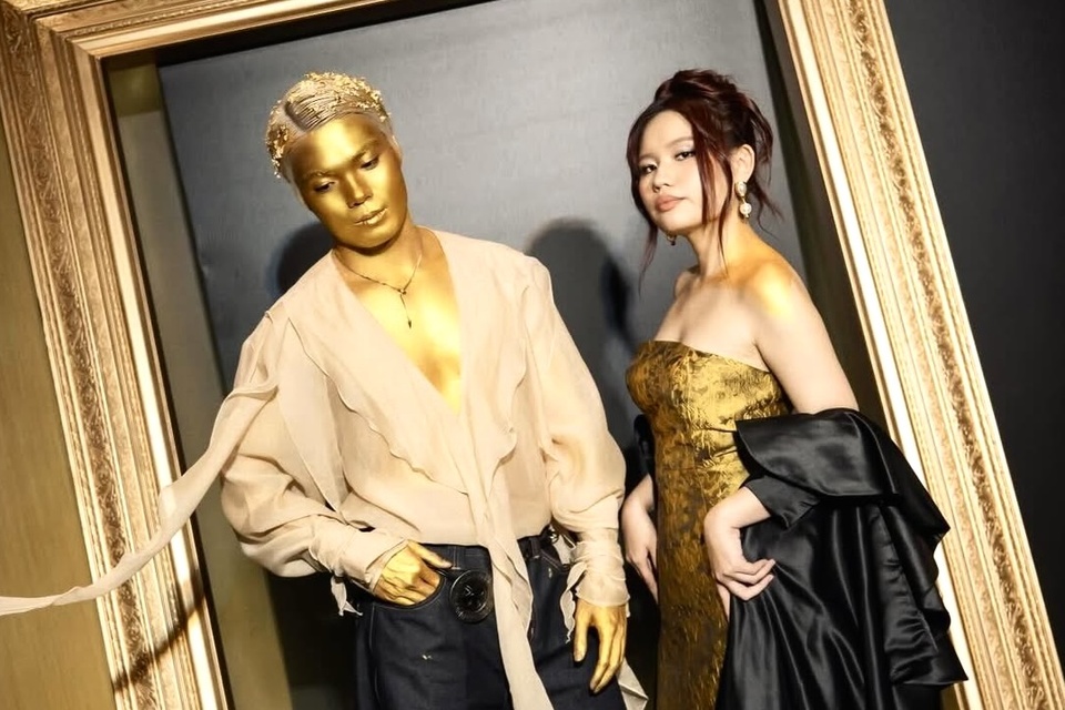 “Tất cả ý tưởng đều do mình tự đưa ra, từ makeup, cách phối đồ đến phụ kiện", anh nói. Để hiện thực hóa concept dát vàng lên cơ thể và tóc, Thắng book một đội makeup chuyên nghiệp, đồng thời đặt may riêng chiếc áo organza.
