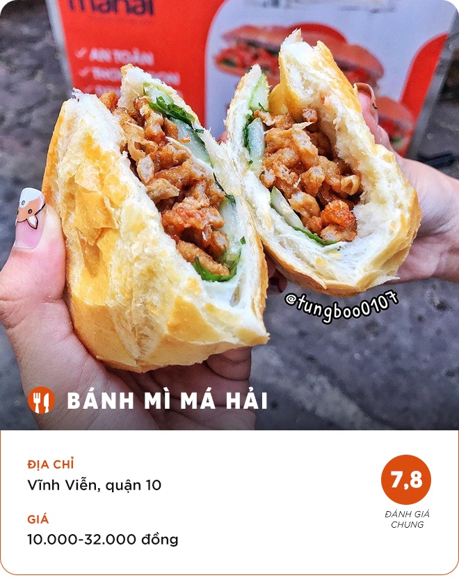 Hieu Ng: “Bánh mì Má Hải khá nổi tiếng, có nhiều chi nhánh. Bánh mì chả cá ốp la ở đây ăn ngon, bánh mì giòn, chả cá nhiều, trứng chiên còn nóng nhưng hơi nhiều dầu. Chả cá làm và chiên tại chỗ nên nóng, giòn, không bị hôi dầu. Ổ bánh 20.000 đồng nhưng đầy đặn, có rau răm và đồ chua ăn kèm. Bánh mì đựng trong gói giấy lịch sự. Tương ớt hơi cay”.