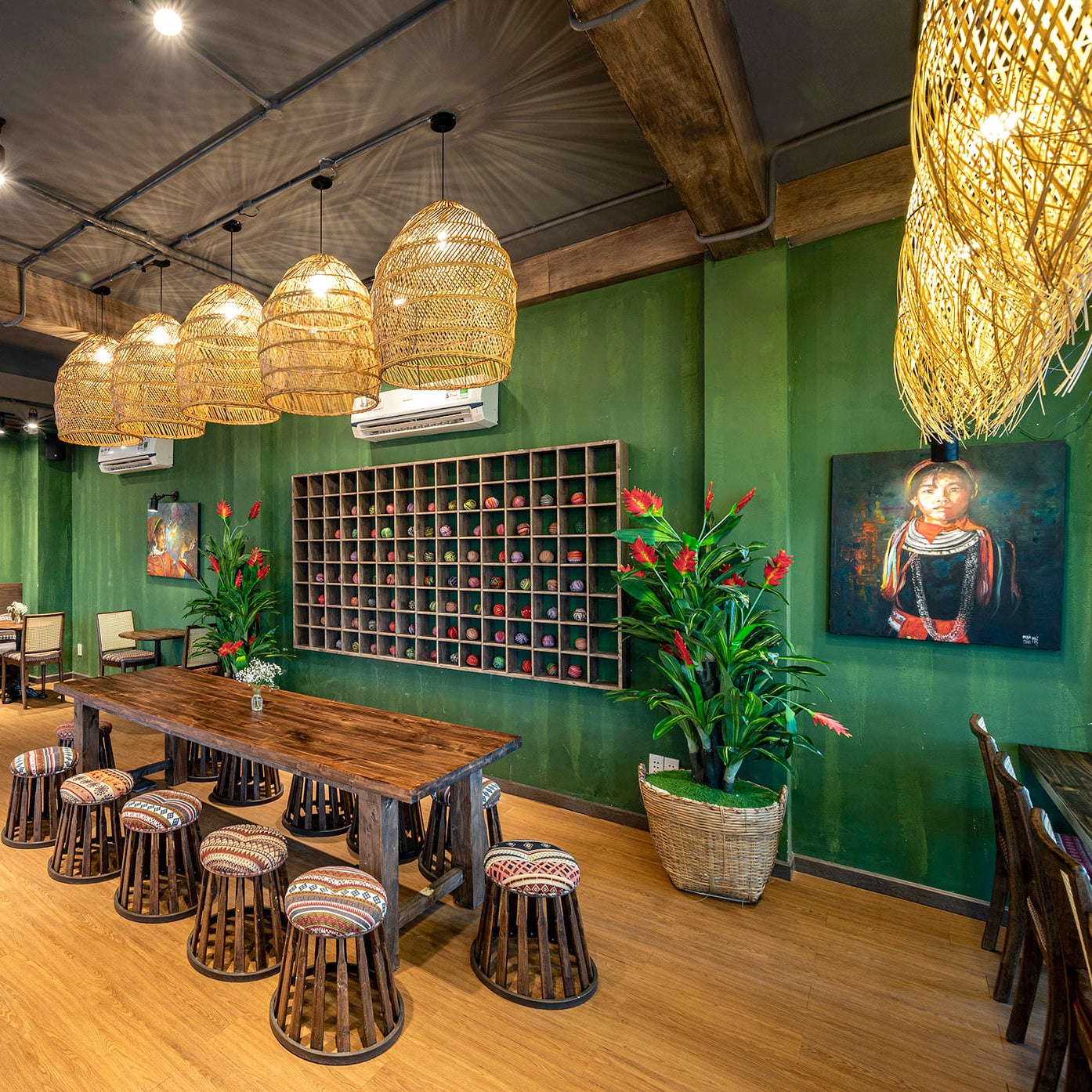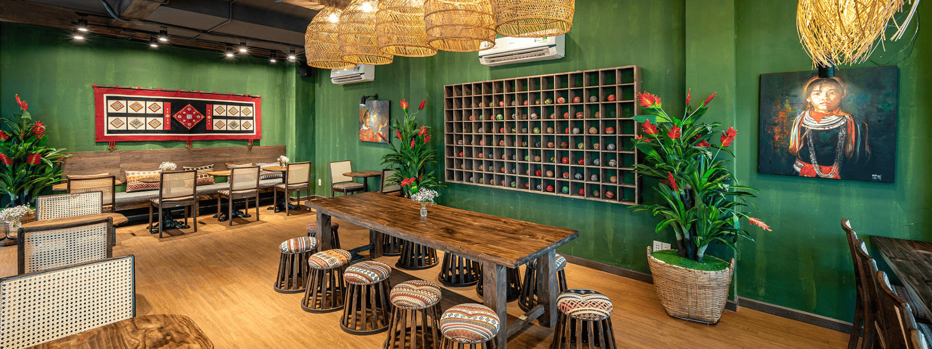 Quán cà phê nổi bật với lối thiết kế đậm chất Tây Bắc. Khi bước vào, tôi khá ấn tượng với cách trang trí lạ mà quen bởi những bức tranh phụ nữ vùng cao, họa tiết thổ cẩm... Nội thất chủ yếu bằng gỗ, tường được sơn màu mộc mạc và tối giản.