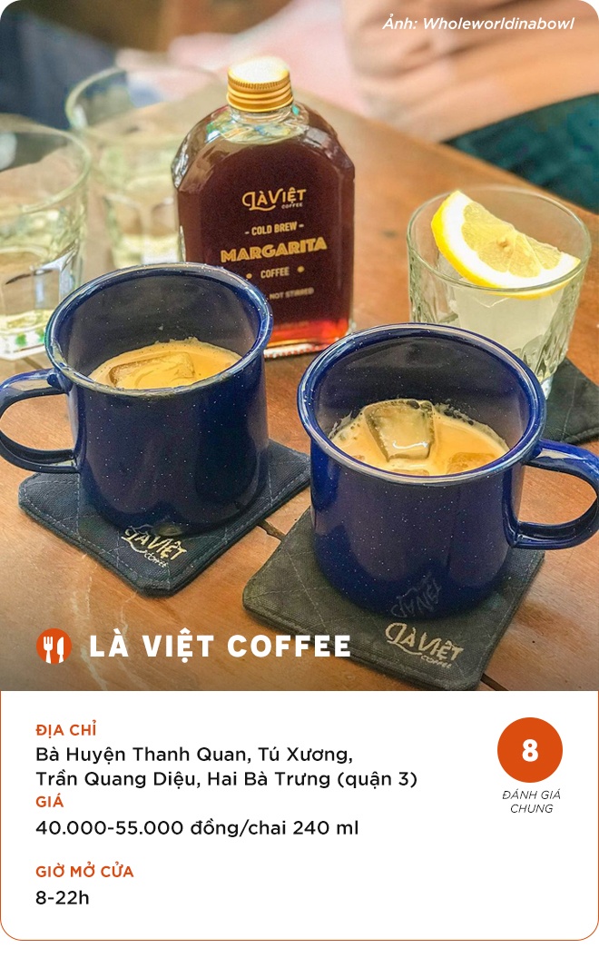 Là Việt Coffee là chuỗi cà phê quen thuộc của nhiều tín đồ ẩm thực ở TP.HCM. Quán thu hút thực khách bởi chất lượng đồ uống đồng đều. Menu đồ uống đóng chai gồm cà phê đen, cà phê sữa, cold brew và cold brew margarita.