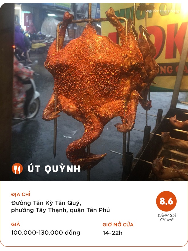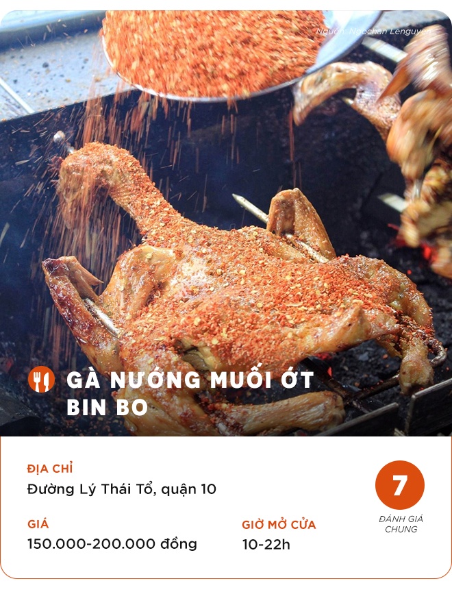 Llickthespoon: "Tôi đi ngang đường Sư Vạn Hạnh thấy chỗ này nướng gà quay quay thơm quá nên tấp vô mua thử. Gà nướng muối ớt 160.000 đồng/con dành cho 2-3 người ăn. Gà được ướp thấm gia vị, lớp da phủ lớp muối ớt màu đỏ bắt mắt, ăn mặn mặn, có điều chưa được cay lắm. Thịt gà nướng nguyên con mà không bị khô. Quán còn có chế biến thêm các vị khác như nướng mọi, nướng mật ong. Giá rẻ, đồ ăn chất lượng, đáng thử".