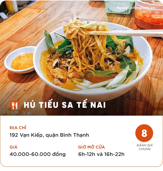 Quán nằm trong khu ẩm thực Vạn Kiếp, mỗi bát hủ tiếu sa tế ở đây có vị béo bùi từ phần nước dùng cùng với mùi thơm của hành, sả, lá quế, quyện vị ngọt từ thịt nai, bò. Từng thành phần tạo nên tô hủ tiếu hài hòa về hình thức lẫn hương vị. Bạn có thể gọi thịt tái hoặc chín tùy ý thích.