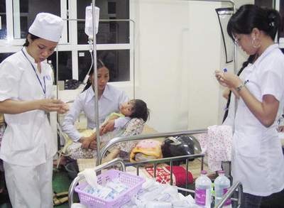 | Nhân viên y tế truyền dịch cho trẻ bị sốc phản vệ. |