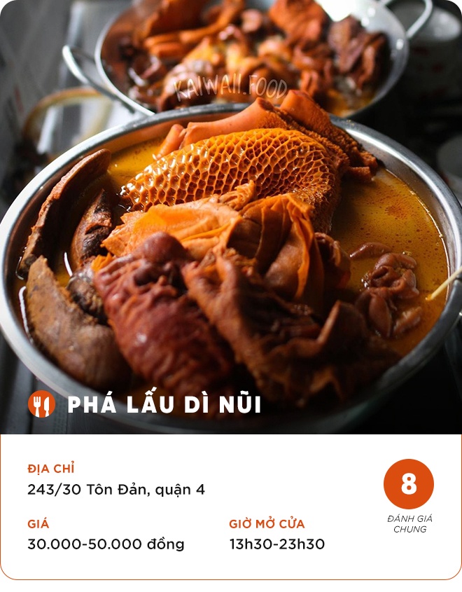 Quận 4 là thiên đường ẩm thực với đủ món ăn ngon, trong đó có phá lấu. Địa chỉ phá lấu nổi tiếng ở quận này là quán dì Nũi. Quán nằm trong hẻm nhỏ trên đường Tôn Đản nhưng luôn đông khách.