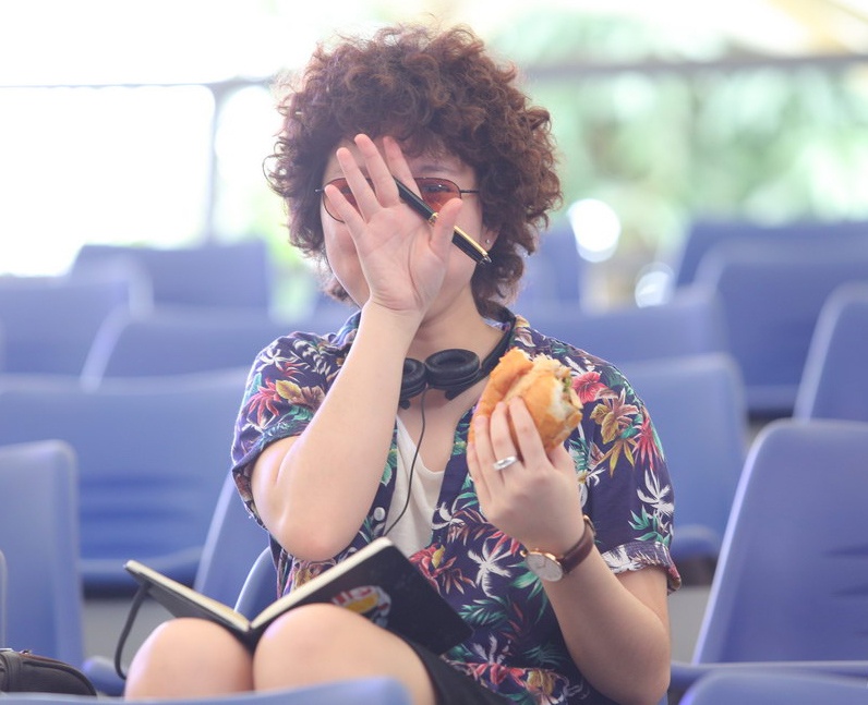 | Tiên Tiên tranh thủ ăn bánh mì khi đang tập luyện. Đáng ra màn biểu diễn của Tiên Tiên đã xuất hiện trong live show Bài hát yêu thích tháng 3 nhưng phải bảo lưu vì cô bị ốm. |