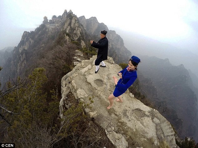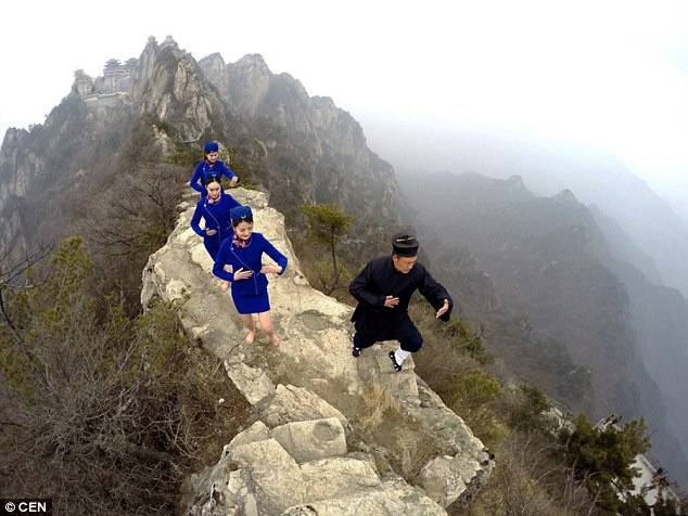 Trong trang phục tiếp viên màu xanh, chỉ thiếu đôi giày cao gót, 3 cô gái trẻ học theo hướng dẫn của một bậc thầy kungfu đạo Lão để có ý chí kiên cường. |