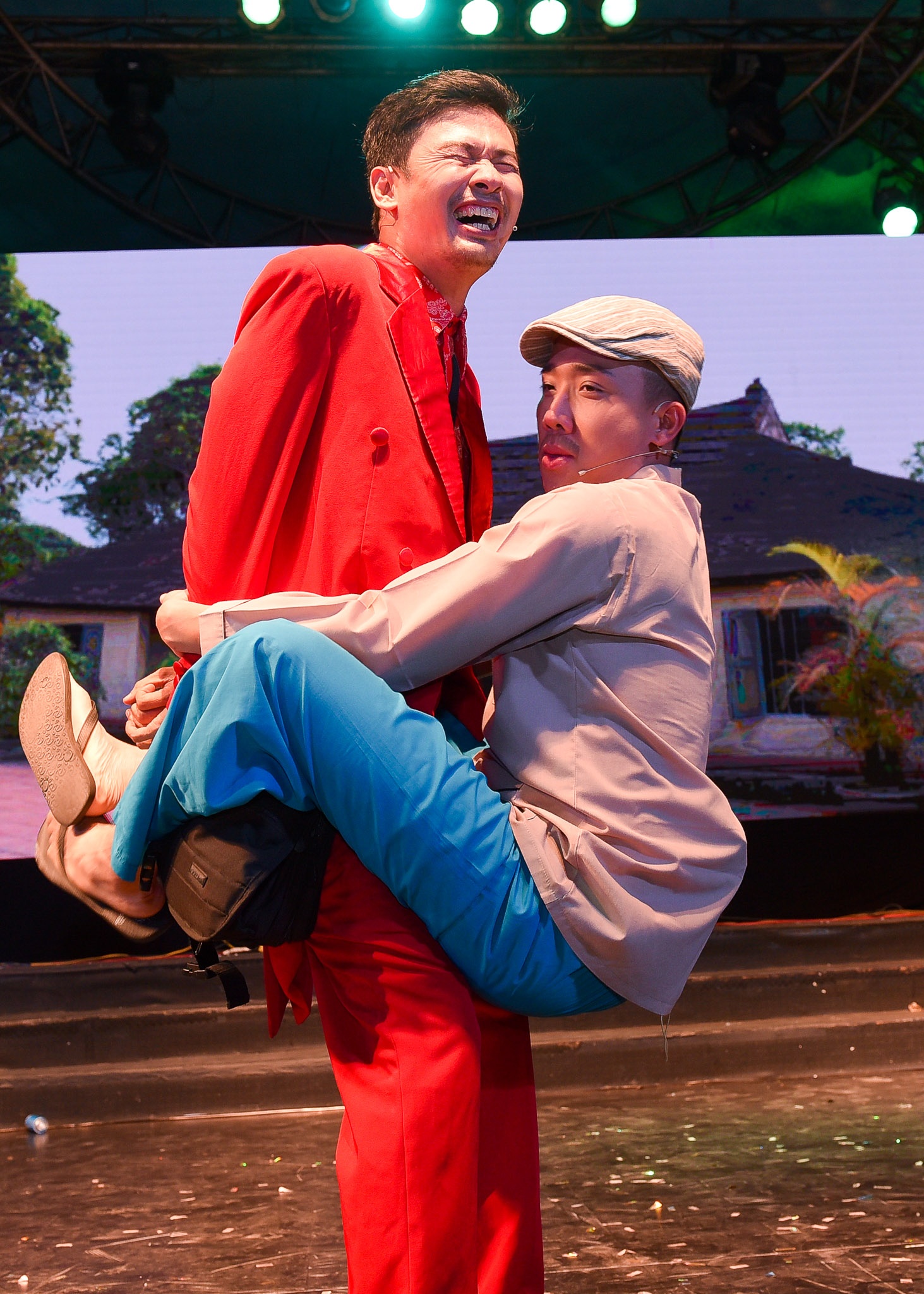 Dù tỏa sáng nhưng Trấn Thành không quên phối hợp cùng Tiết Cương và Thu Trang. Cuối chương trình, anh cũng khéo léo chúc mừng đàn anh thành công với live show đầu tiên trong sự nghiệp. |