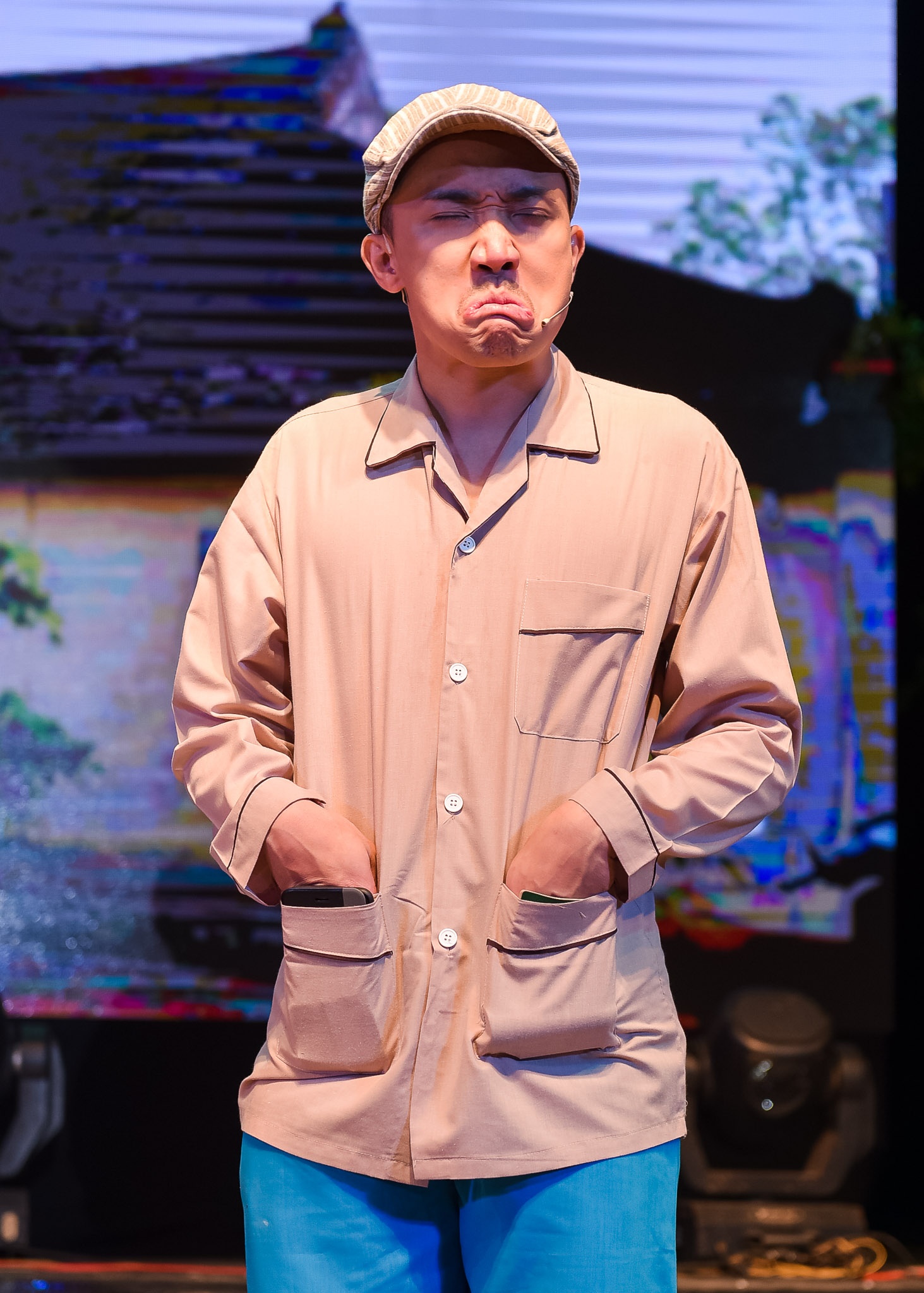 Trấn Thành hợp diễn cùng Tiết Cương và Thu Trang trong vở Kén rể. Vừa bước ra sân khấu, MC điển trai đã làm khán giả bật cười sảng khoái vì màn độc thoại thông minh, duyên dáng. |