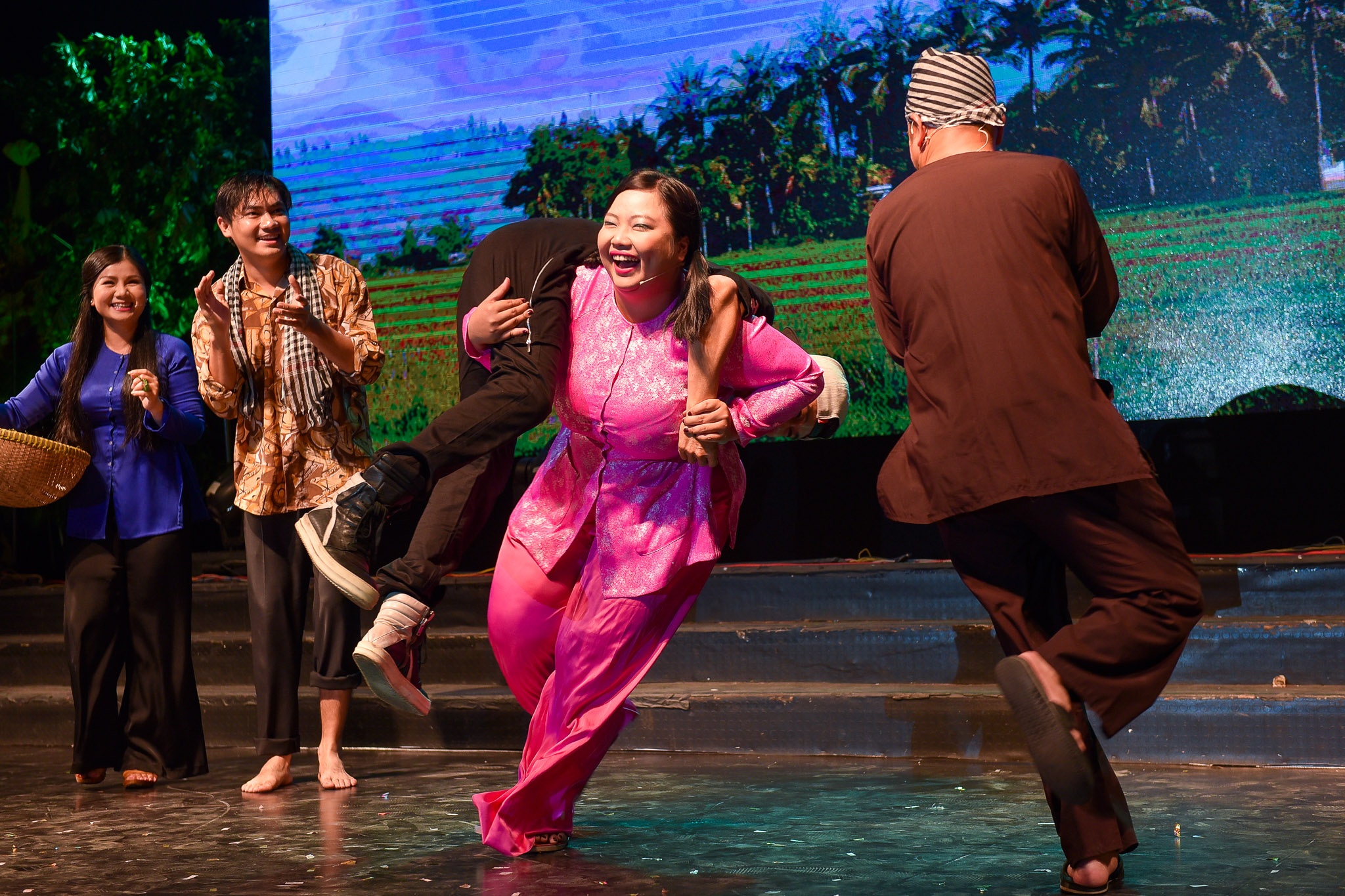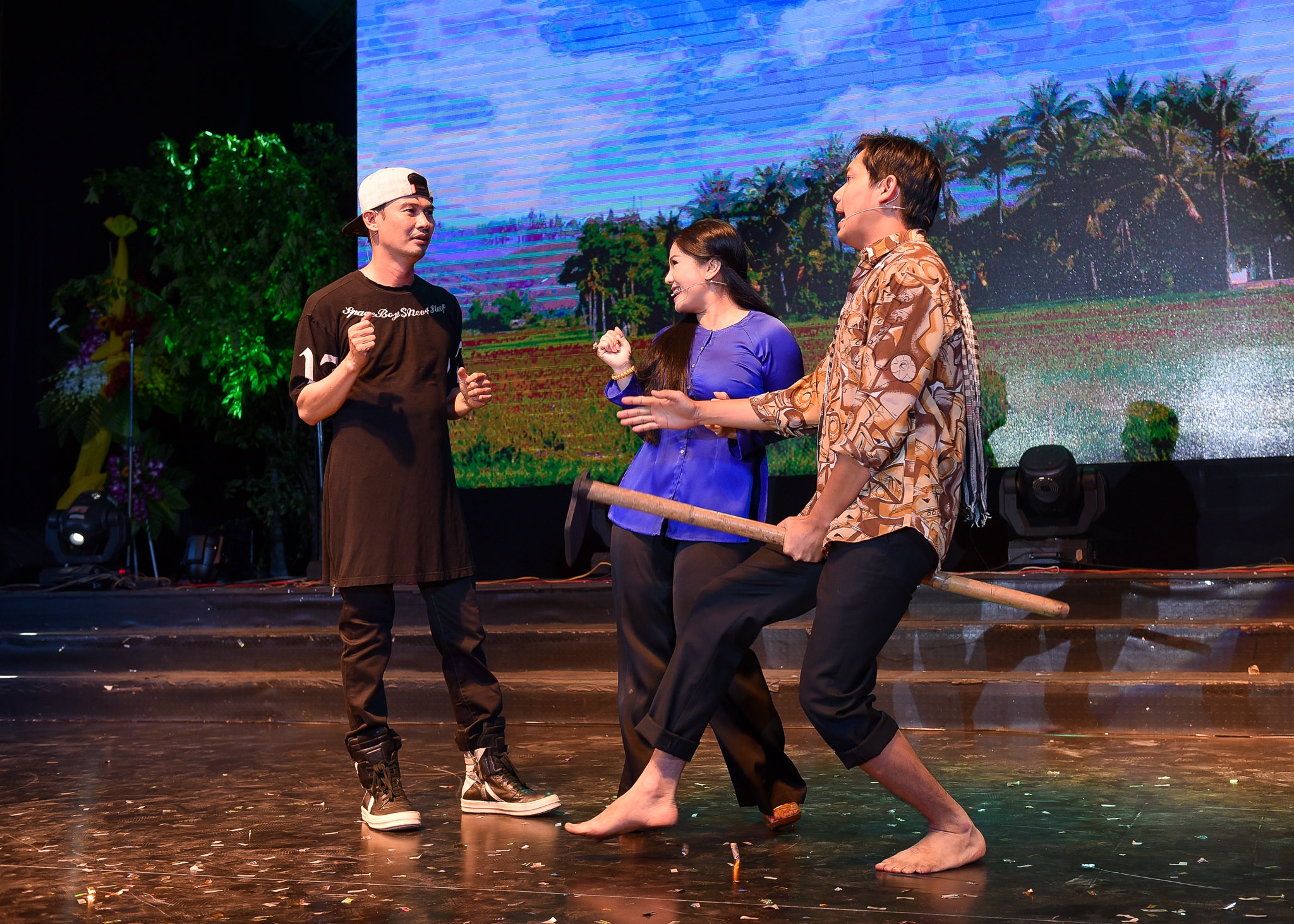 Vở Tình quê khép lại với cái kết ngọt ngào đồng thời là dịp để 3 thầy trò Minh Nhí - Việt Hương - Tiết Cương hội ngộ trên sân khấu. |
