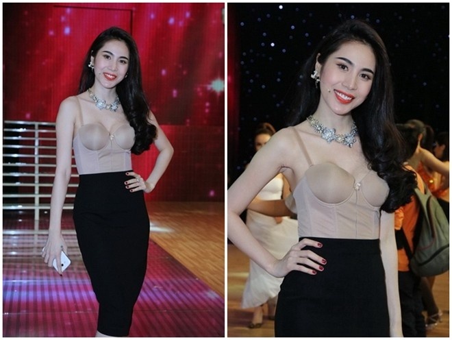 | Linh Chi với bra top cắt khoét táo bạo khoe vòng 1 đẹp. |