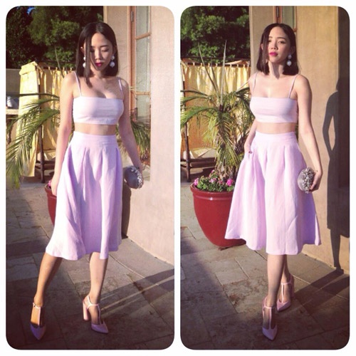 | Gợi ý cho phong cách tiệc tùng với bra top và chân váy midi. |