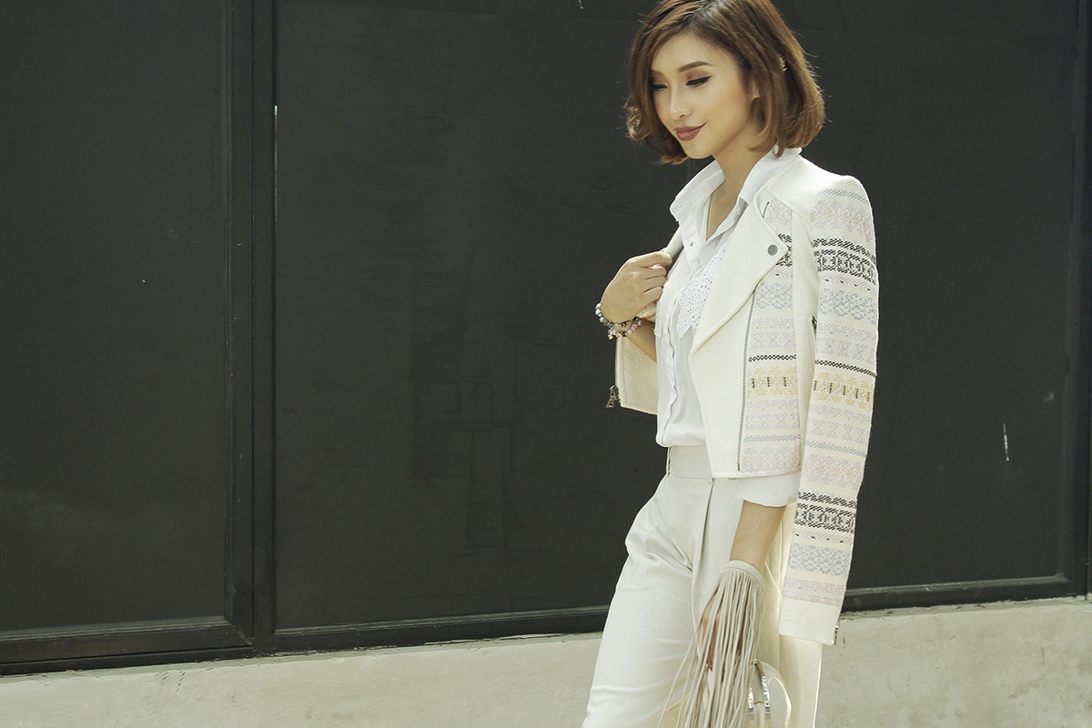 | Như Quỳnh duyên dáng với set đồ trắng tinh khôi, áo jacket họa tiết khoác hờ sành điệu. |