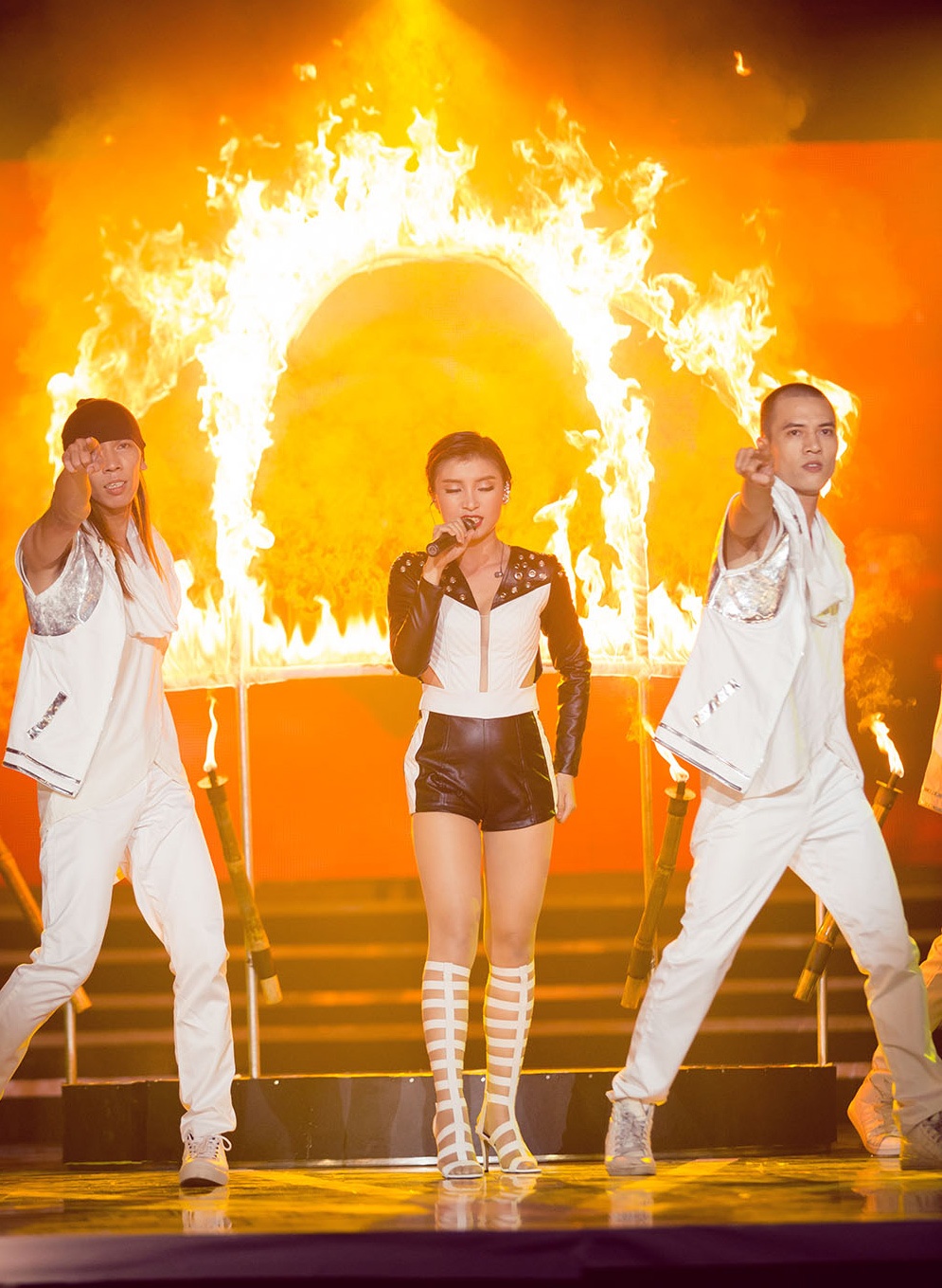 | Nữ ca sĩ có màn kết hợp cùng với nhóm FB Boiz trong ca khúc Tên tôi Việt Nam. Đây cũng là lần thứ 2, FB Boiz trở lại với chương trình, sau liveshow của Hoàng Tôn và Minh Thư. |
