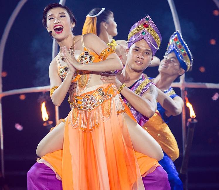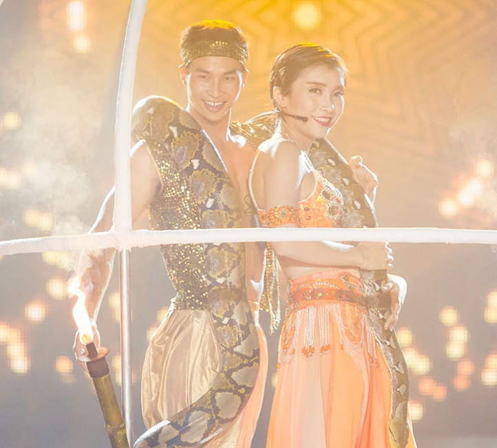 Tiêu Châu Như Quỳnh mặc sexy, vác trăn 30kg trên sân khấu