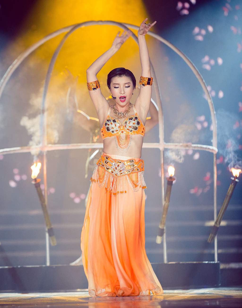 Cháu gái Lam Trường diện nội y khoe eo thon và vác chú trăn lớn khi biểu diễn ca khúc "Vấn vương" trong liveshow diễn ra tối 18/10, tại TP.HCM.