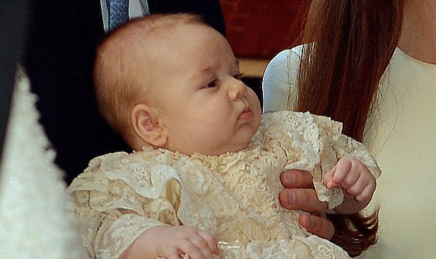 | Thái tử Charles trong lễ rửa tội. Đầu bé George tròn, ít tóc giống đầu ông nội lúc nhỏ. Ảnh: Dailymail. |