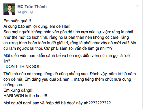 Nam MC viết: "Em buồn quá! Ai cũng bảo em lợi dụng, em dê Hari! Sao mọi người không nhìn vào góc độ tích cực của sự việc rằng là phải như thế mới có kịch tính, rằng họ là bạn thân nên không có care (lo lắng), rằng chương trình hoàn toàn là để giải trí, rằng là phải như vậy nó mới vui? Mà cứ làm ngược lại thôi. Cứ phải săm soi vấn đề làm gì nhỉ? Một diễn viên nam diễn cảnh bế và hôn một diễn viên nữ mà gọi là "dê" á? I don't think so! (Tôi không nghĩ như vậy)".