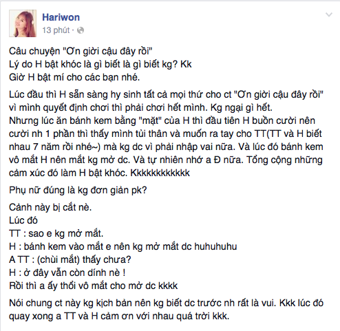 | Trước những lời đồn đoán về việc "đạo" ý tưởng Hàn Quốc của tiểu phẩm Yêu kín từ cư dân mạng, fanpage của Hari Won vừa bật mí lý do bật khóc trên truyền hình của nữ ca sĩ vừa ngầm khẳng định, chương trình không có kịch bản nên không biết trước được. |