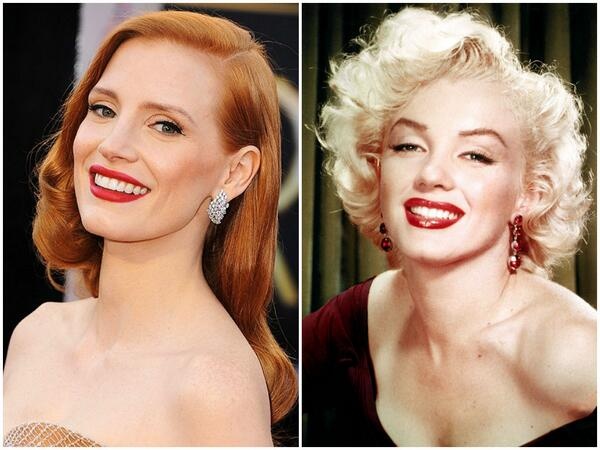 | Nữ diễn viên Jessica Chastain sắp sửa hóa thân thành Marilyn Monroe (phải), biểu tượng tình dục của nước Mỹ trong thế kỷ XX. |
