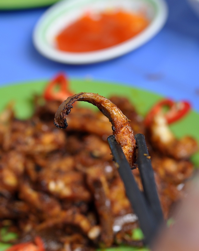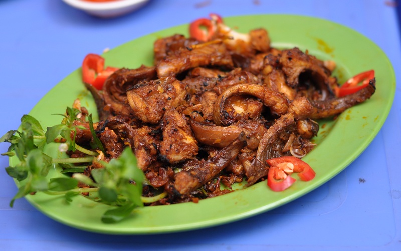 Cá đuối nướng sa tế hoặc xào sả ớt là món đáng để bạn thưởng thức. Nướng sa tế chắc được nhiều người thích vì đồ nướng bao giờ cũng thơm dậy mùi hơn. Nhưng với ai có gu “mềm đậm đà” thì xào sả ớt sẽ là khoái khẩu cho bạn. Cả hai món giá đều 80.000 đồng, tưởng chừng không được ngon rẻ song đĩa rất đầy đặn, không hề độn rau củ, cá lại nạc, không xương, đủ cho nhóm bạn gắp thoải mái và cắn “ngập răng”.