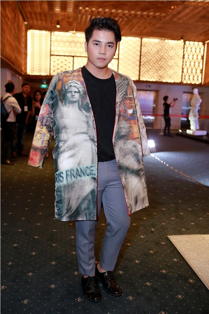| NTK Lý Giám Tiền cũng được dịp ra mắt trang phục trong BST mới của mình với chiếc áo khoác in hình họa tiết nữ thần, phối cùng áo thun đen và quần tây. |