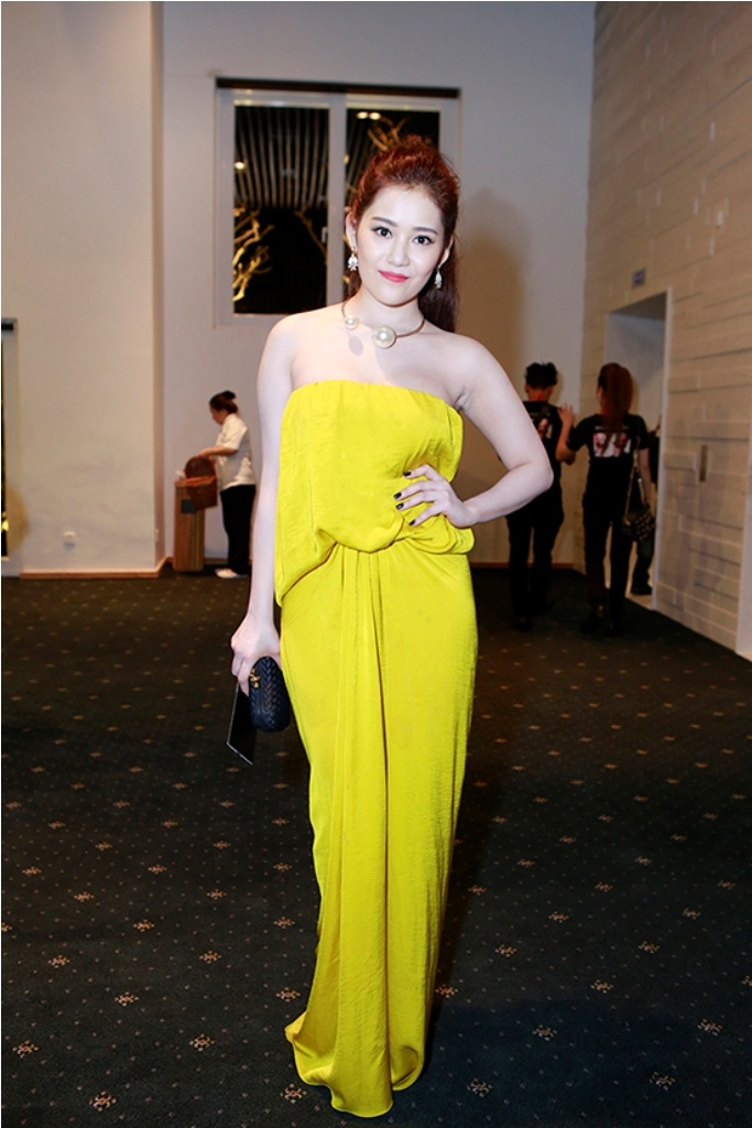 | Một bạn nữ khoe làn da trắng ngần trong chiếc váy quay dài màu vàng chanh quyến rũ và gợi cảm. |