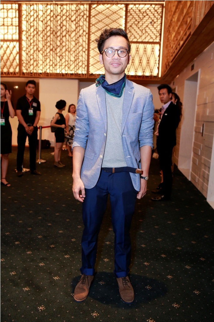 | Anh chàng có gu thời trang đơn giản, áo vest mix cùng quần tây, áo thun, không quên tạo cho mình thêm điểm nhấn bằng chiếc khăn quàng cổ. |