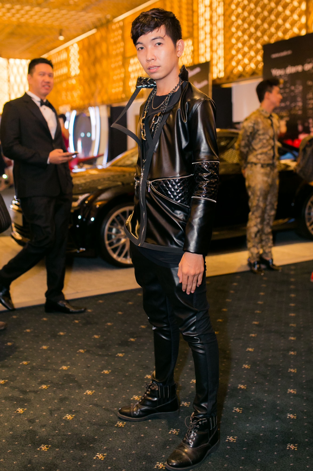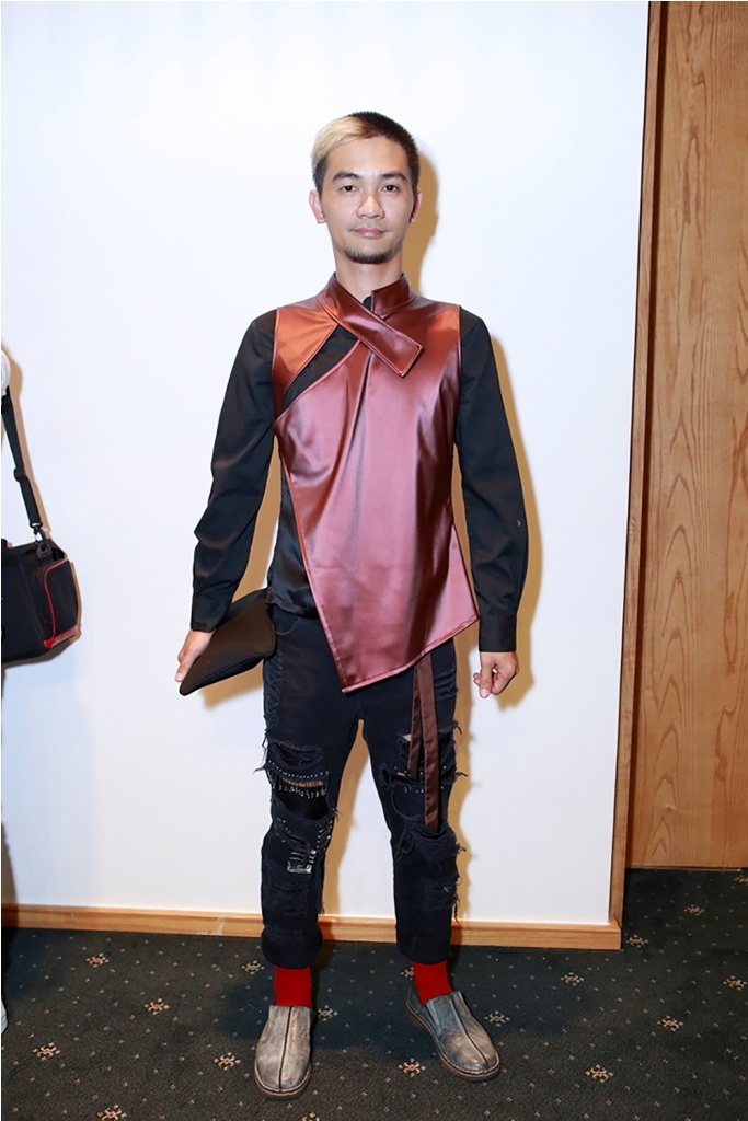 | Tín đồ thời trang Aki Quang có sự kết hợp lạ mắt giữa quần jeans rách, áo da bóng với những đường may bất đối xứng. |