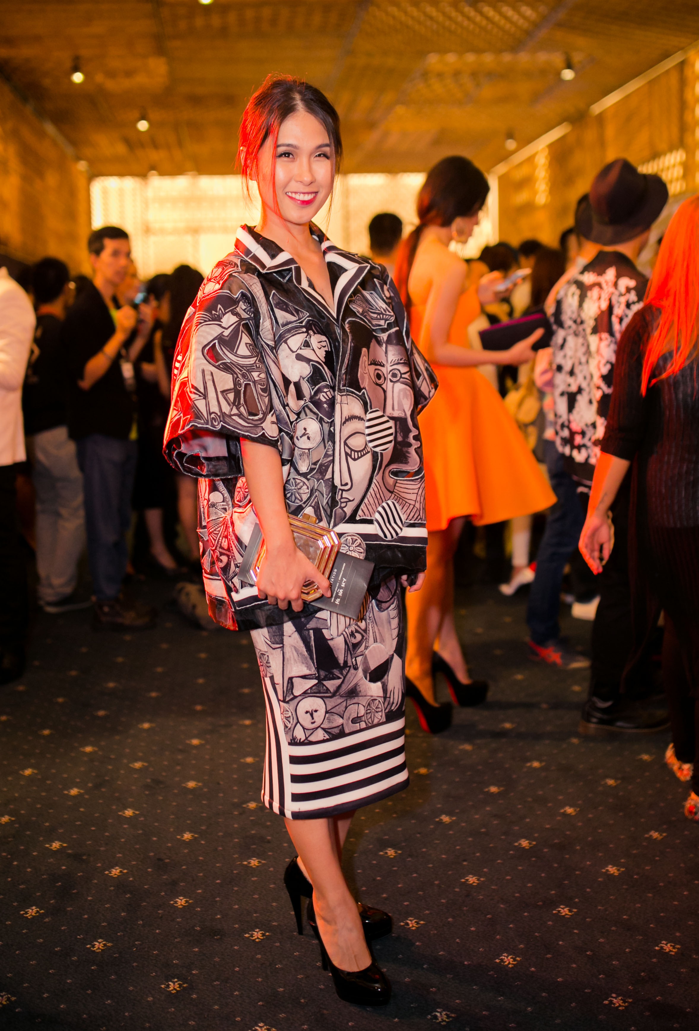 | Hà Mi là một tín đồ thời trang có tiếng ở TP.HCM. Tại nhiều show thời trang, cô luôn xuất hiện với những bộ cánh thể hiện cá tính và gu thời trang hiện đại. Tại sự kiện Tuần lễ thời trang quốc tế Việt Nam, Hà Mi nổi bật với bộ cánh họa tiết tranh Picasso của NTK Công Khanh. Cô cũng khéo léo mix thêm phụ kiện là chiếc clutch cầm tay độc đáo. |