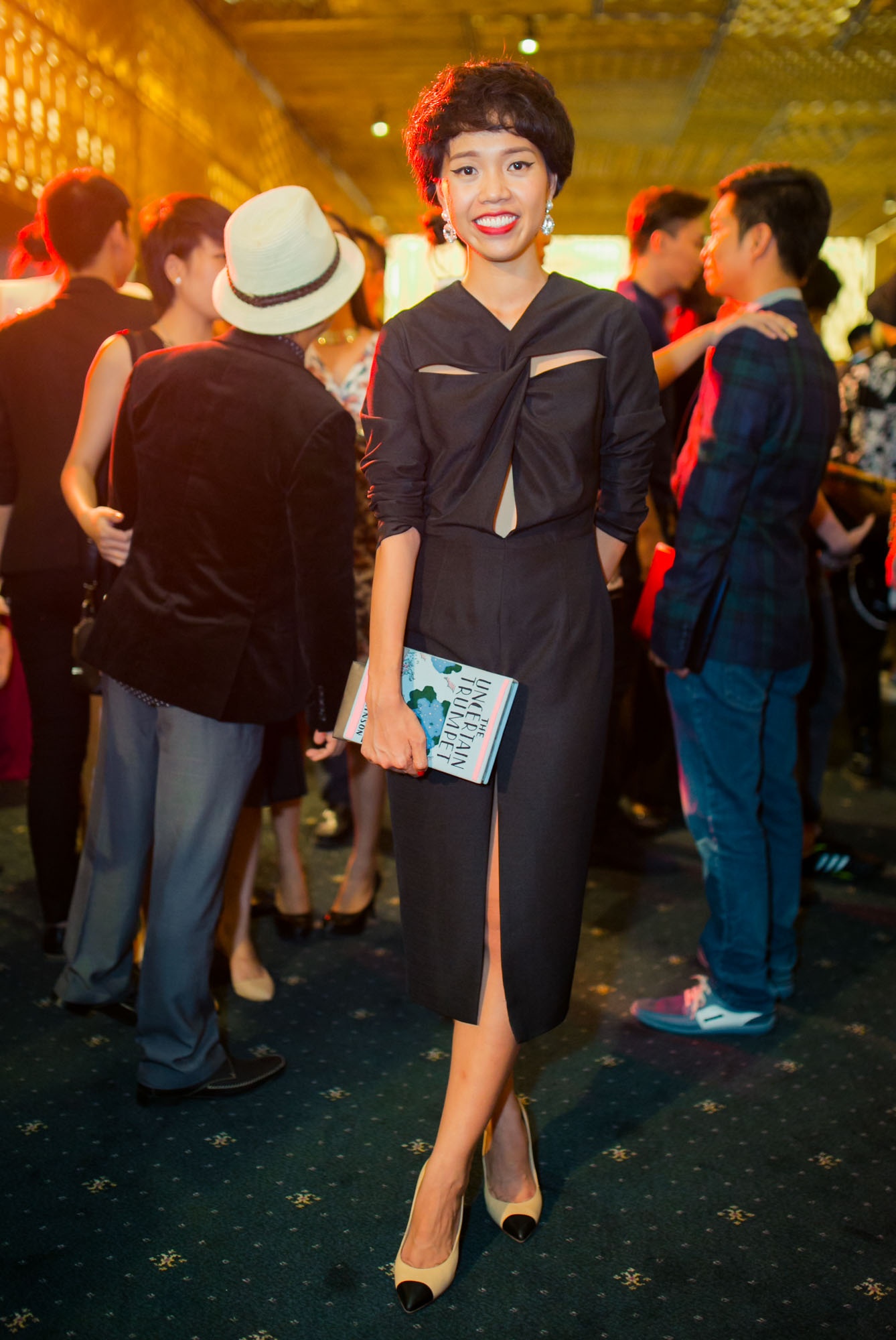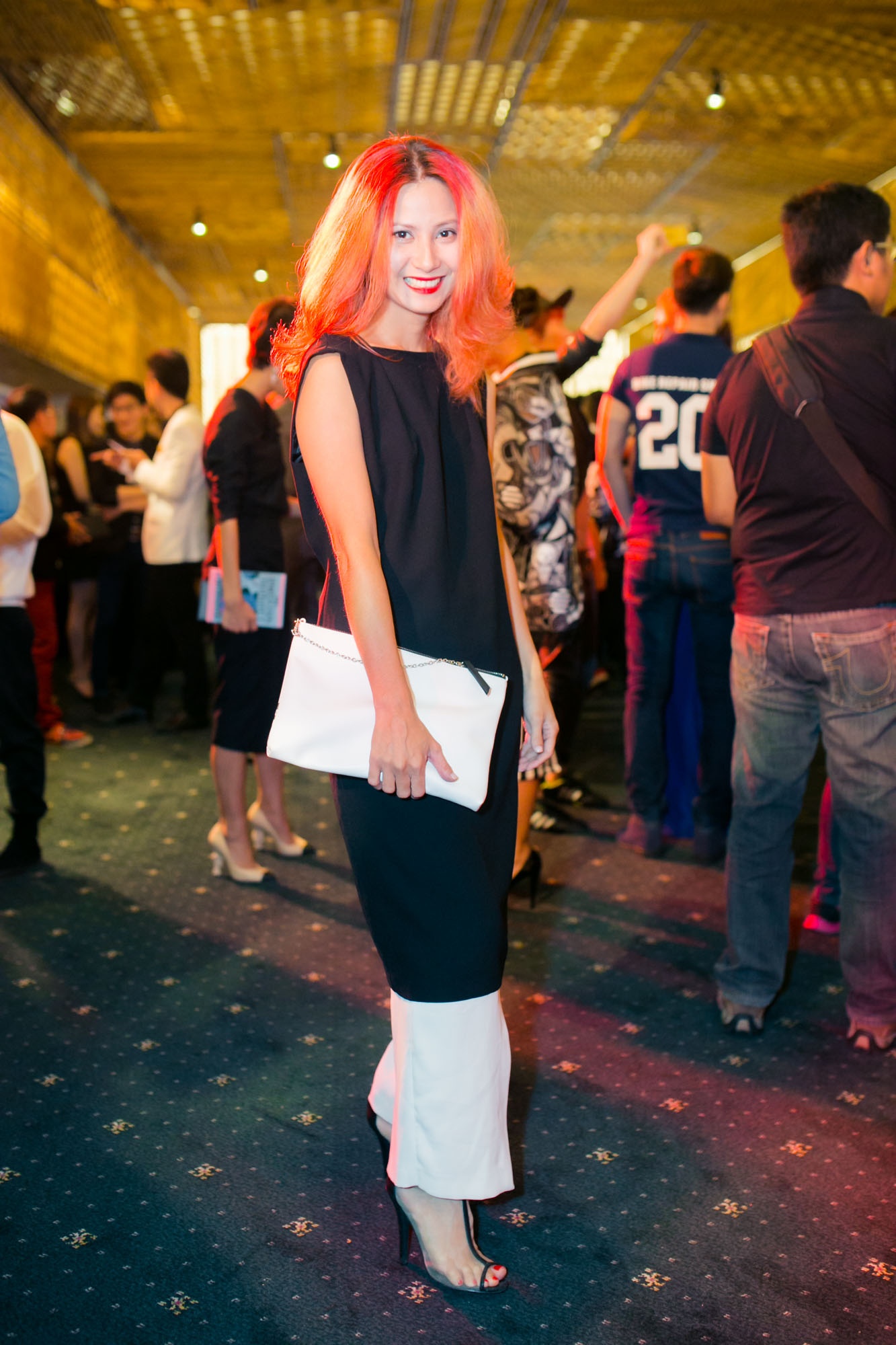 Mai Nguyễn - biên tập viên của các chương trình thời trang tại TP.HCM nổi trội với phong cách ngẫu hứng. Nữ biên tập viên diện chiếc váy suông màu trắng đen kết hợp cùng đôi giày cao gót cá tính. Tín đồ thời trang này có mái tóc cam rực rỡ thu hút sự chú ý tại show diễn tối 1/12.