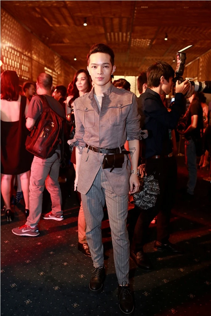| Stylist Kelbin Lei trong bộ suit lịch lãm pha lẫn nét mạnh mẽ, giày bánh mì phá cách. Điểm nhấn là thắt lưng cá tính. |